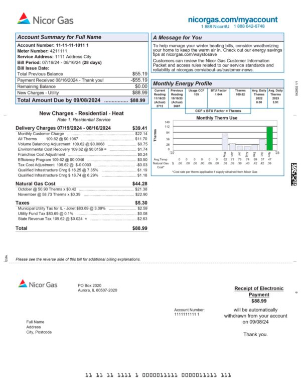 Your order includes JPEG or PDF + JPEG formats in full 300 DPI resolution, with editable fields for customer name, billing address, account number, service dates, usage data, and totals. The layout matches the official Nicor Gas design used in Illinois, ensuring professional appearance and accuracy. Each order comes with free revisions until approved, secure payment processing, and guaranteed 24-hour turnaround backed by 24/7 client support.
