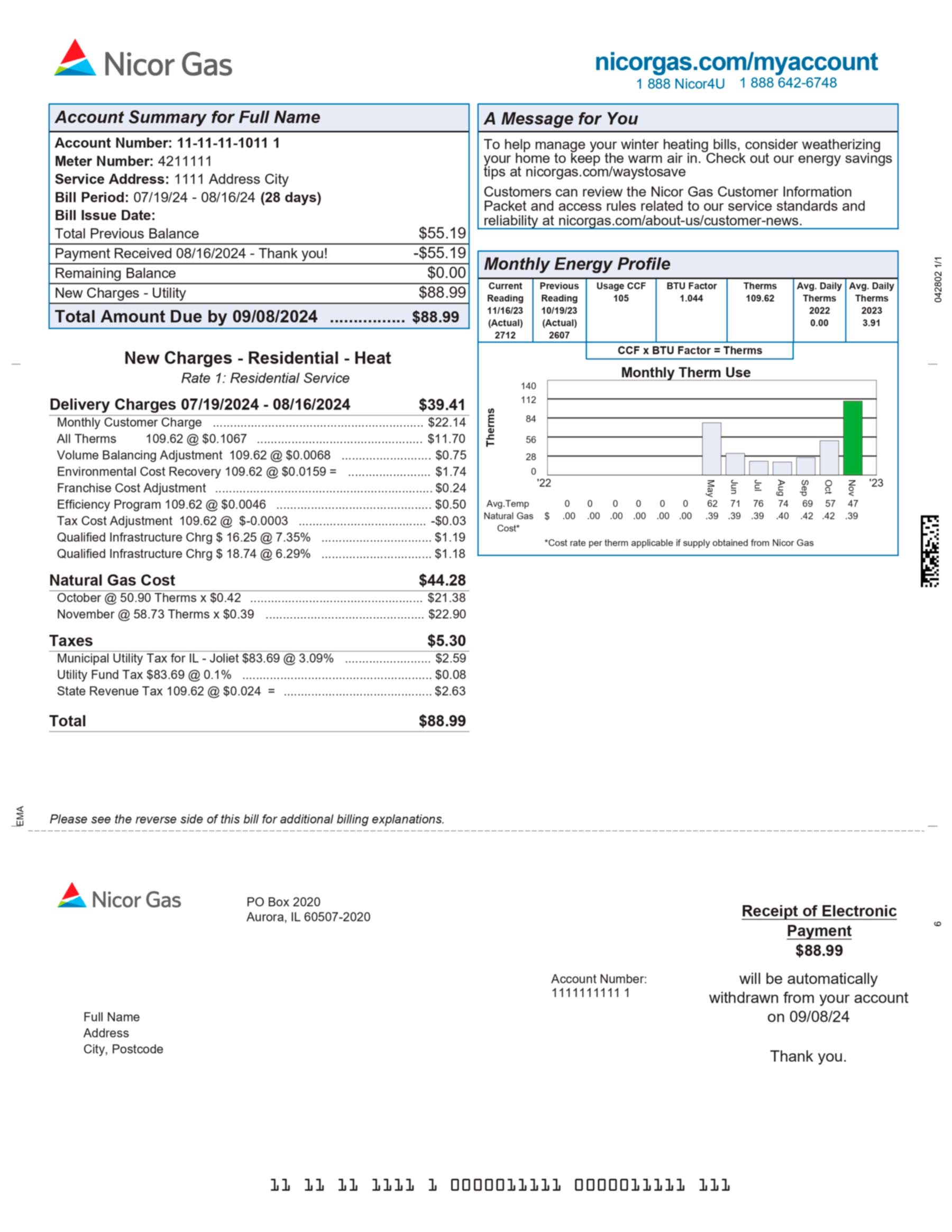 This editable Nicor Gas statement is for lawful and professional purposes, such as UI design, POA/KYC demonstrations, or document visualization. Use ethically within compliant simulation environments only.