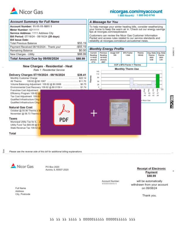 Chicago winters make Nicor Gas service non-negotiable from day one, but a new account across the city or anywhere in Illinois means your first gas statement is still a billing cycle away — and proof of address can’t wait that long. You fill in your details through a secure form, the team builds a professional Nicor Gas bill, and the file is delivered to your email as a JPEG or as both PDF and JPEG with the full package. Turnaround is 24 hours at most, often the same day.