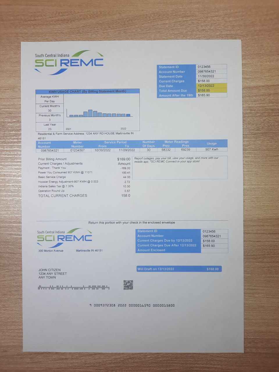 The SCI Indiana utility bill mock-up mirrors real electric statements, ideal for UX use or address confirmation tasks. Many users also discover the AEP Indiana electricity layout and the Constellation Energy template for further comparison and design consistency.