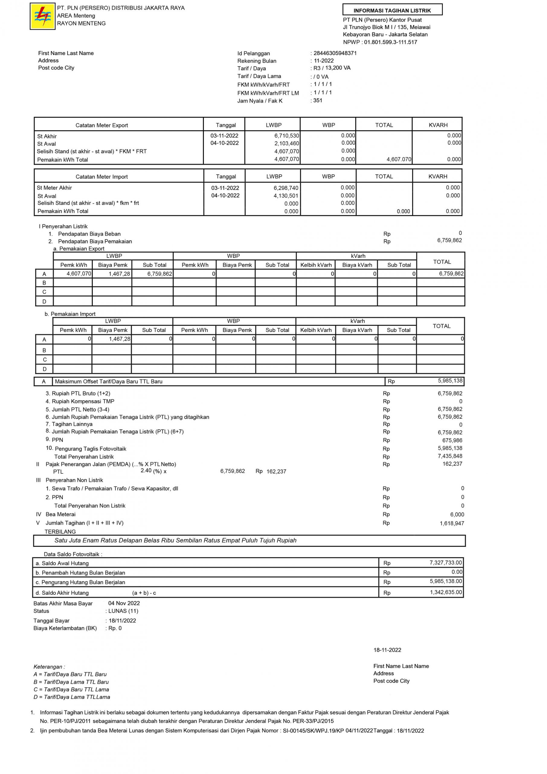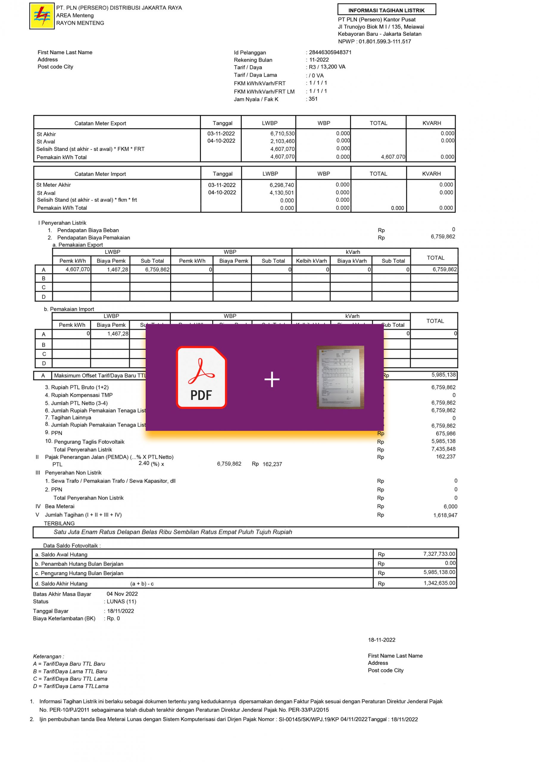 Your download includes JPEG and PDF formats, each optimized for clarity at 300 DPI. The structure mirrors the Persero electricity bill used across Indonesia, complete with editable fields for customer name, service address, billing period, usage, and total payment. This package includes free revisions until approval, 24-hour turnaround, secure checkout, and continuous support from our design team.