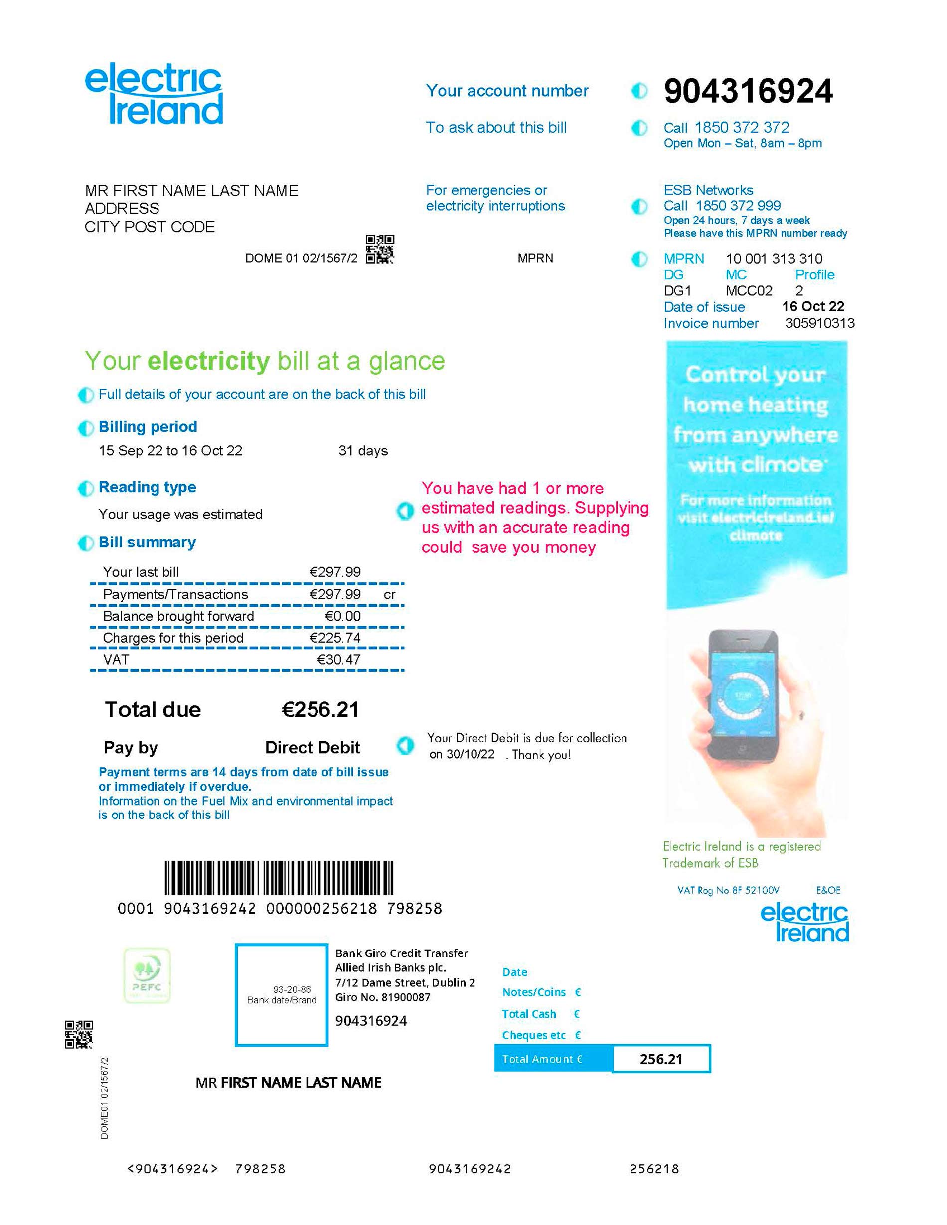 This Irish electricity statement is intended solely for lawful and professional use — such as UI mockups, KYC/POA workflow demonstrations, or internal documentation testing. It should only be used for ethical and compliance-aligned purposes.