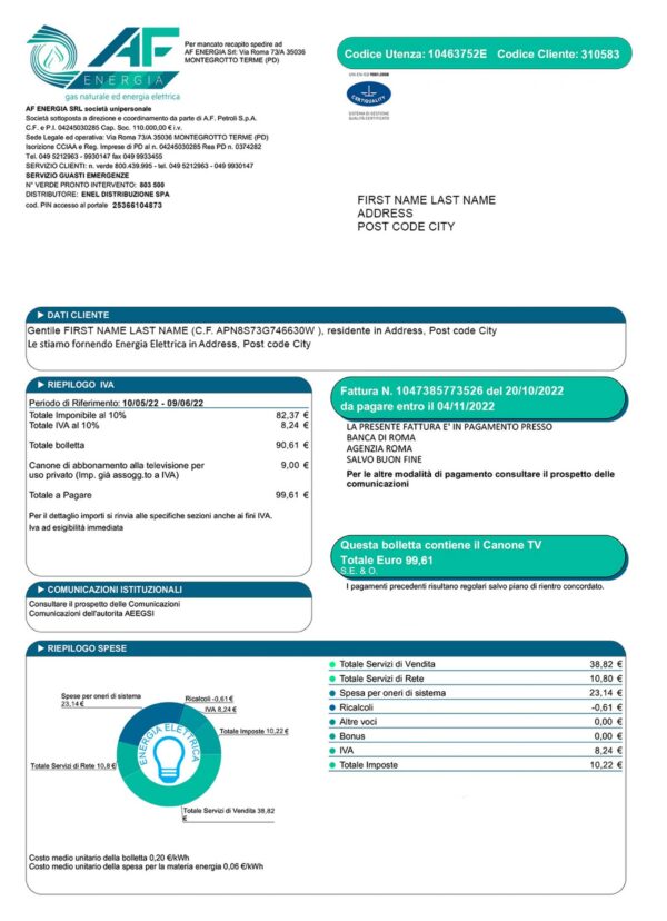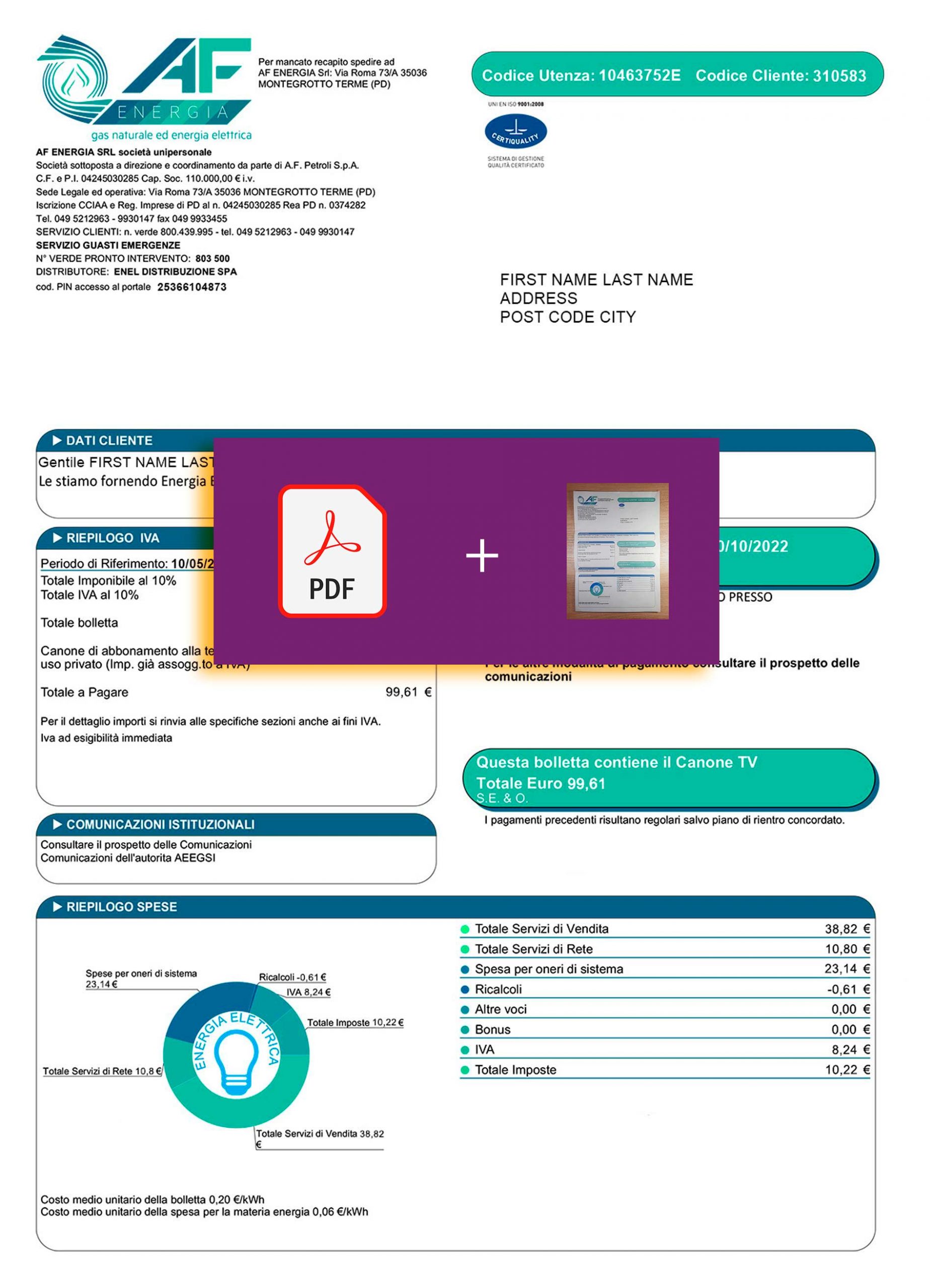 AF Energia’s layout balances branding and billing clarity; try the Edison template to compare formatting. Also explore the Italia e Luce gas bill to evaluate editable sections and realistic proof-of-address elements.