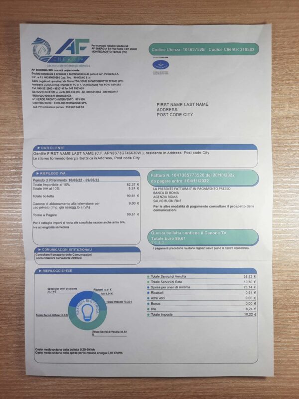 Moved to Italy and your AF Energia account is set up, but the first electricity bill in your name is still a billing cycle away when proof of address is needed today. The team takes your details, prepares an AF Energia electricity bill in your name, and sends it straight to your inbox as a JPEG or PDF+JPEG. Done within 24 hours, frequently the same day.