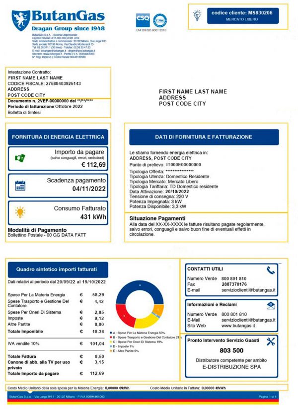 This Butan Gas template emphasizes meter detail and readable totals—check out the Enel version to compare layouts. You might also explore the AF Energia sample to see alternative typographic choices for address verification pages.