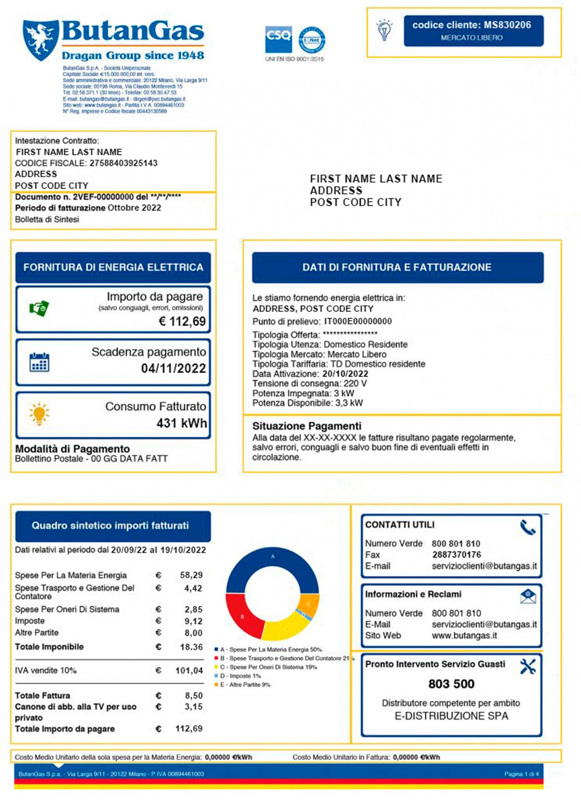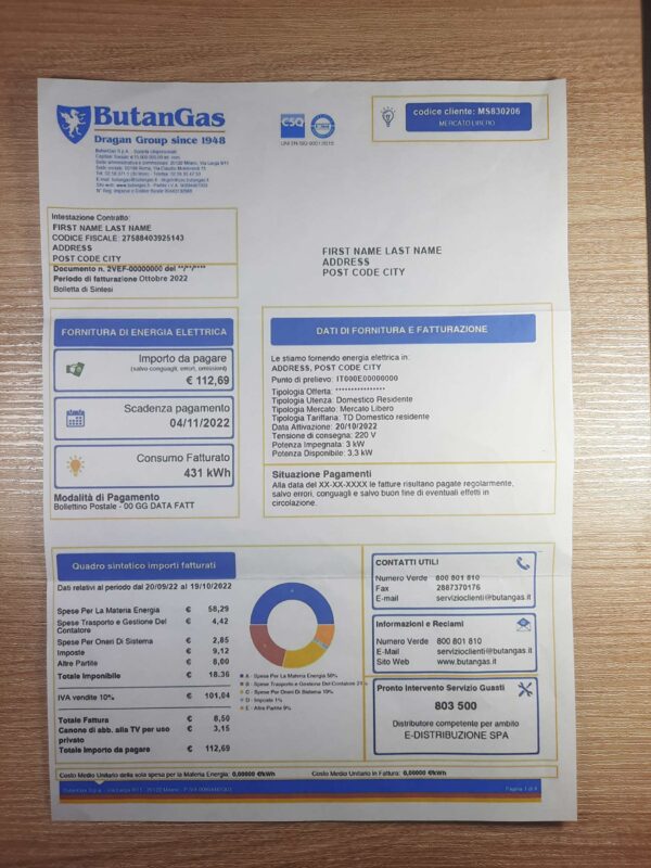 This editable ButanGas Italy gas bill template is crafted to accurately reflect the layout and structure of real 2025 Italian energy statements. It’s a professional, high-resolution (300 DPI) document suitable for POA/KYC verification, compliance training, and billing UI design simulations. With a Done-For-You workflow, our team personalizes every detail — from customer name and address to usage data and totals — ensuring visual realism and technical precision for design and documentation purposes.