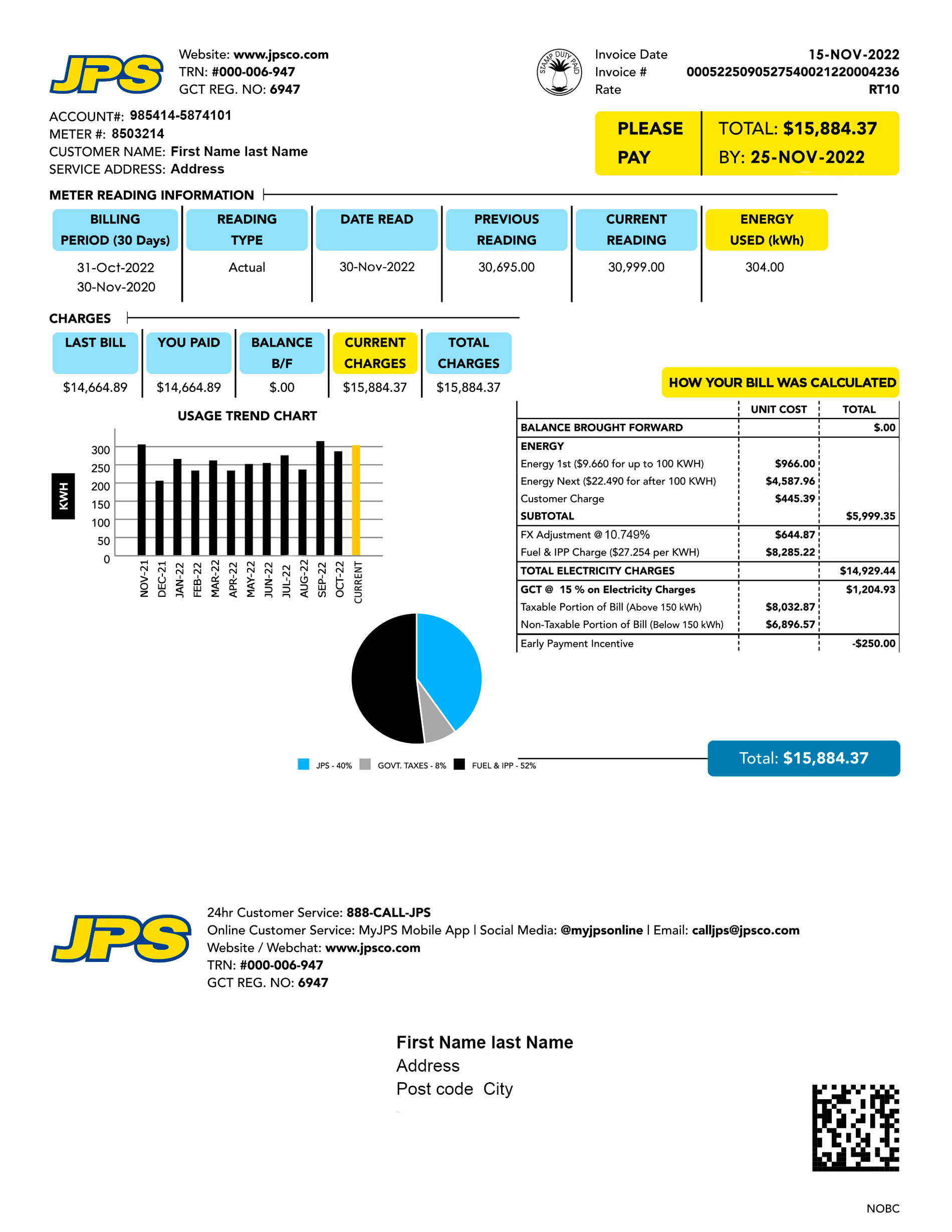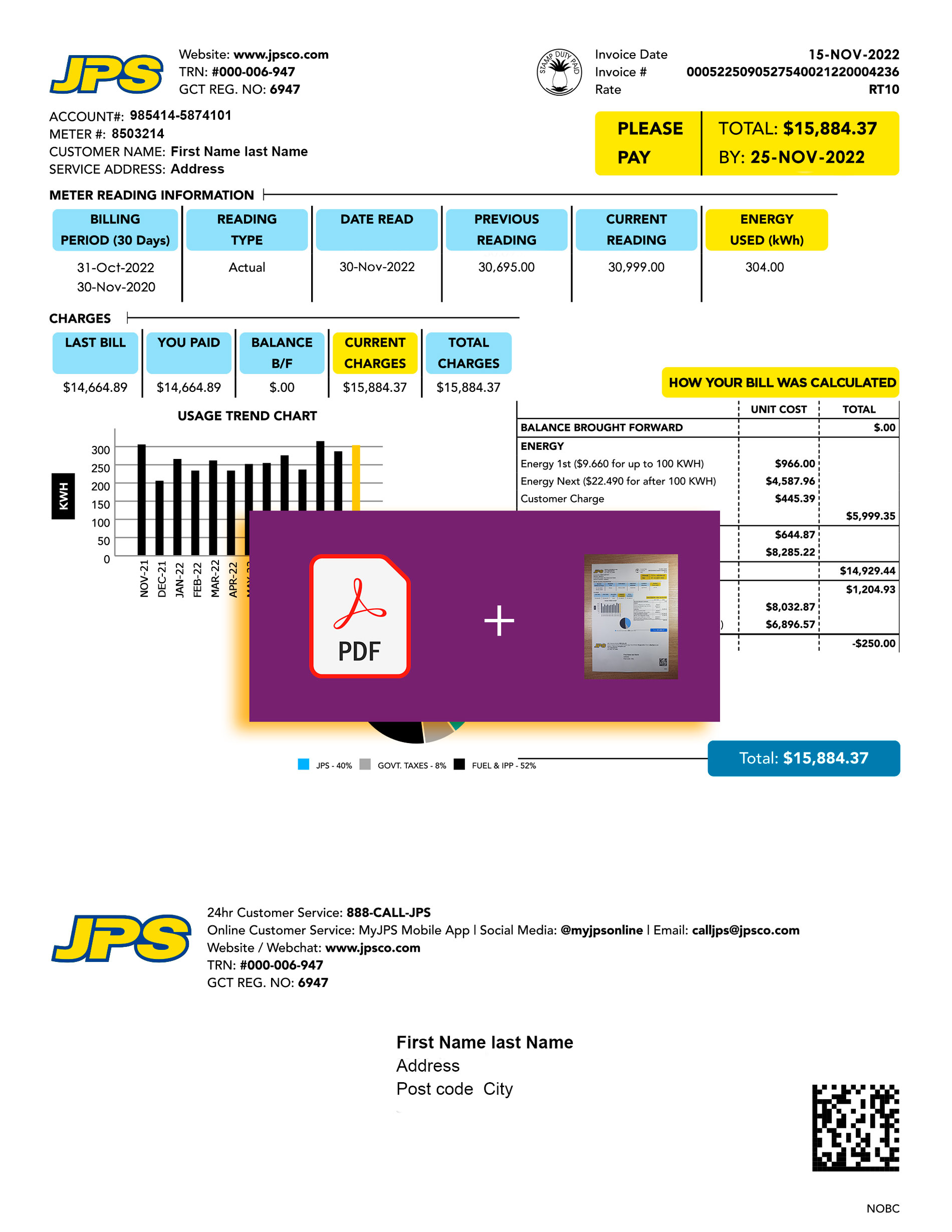 Editable elements include customer data, billing cycle, usage and charges, and totals. The layout is preserved to match JPS’s authentic design and is fully compatible with Photoshop and common PDF editors, retaining 300 DPI clarity for both print and digital use.