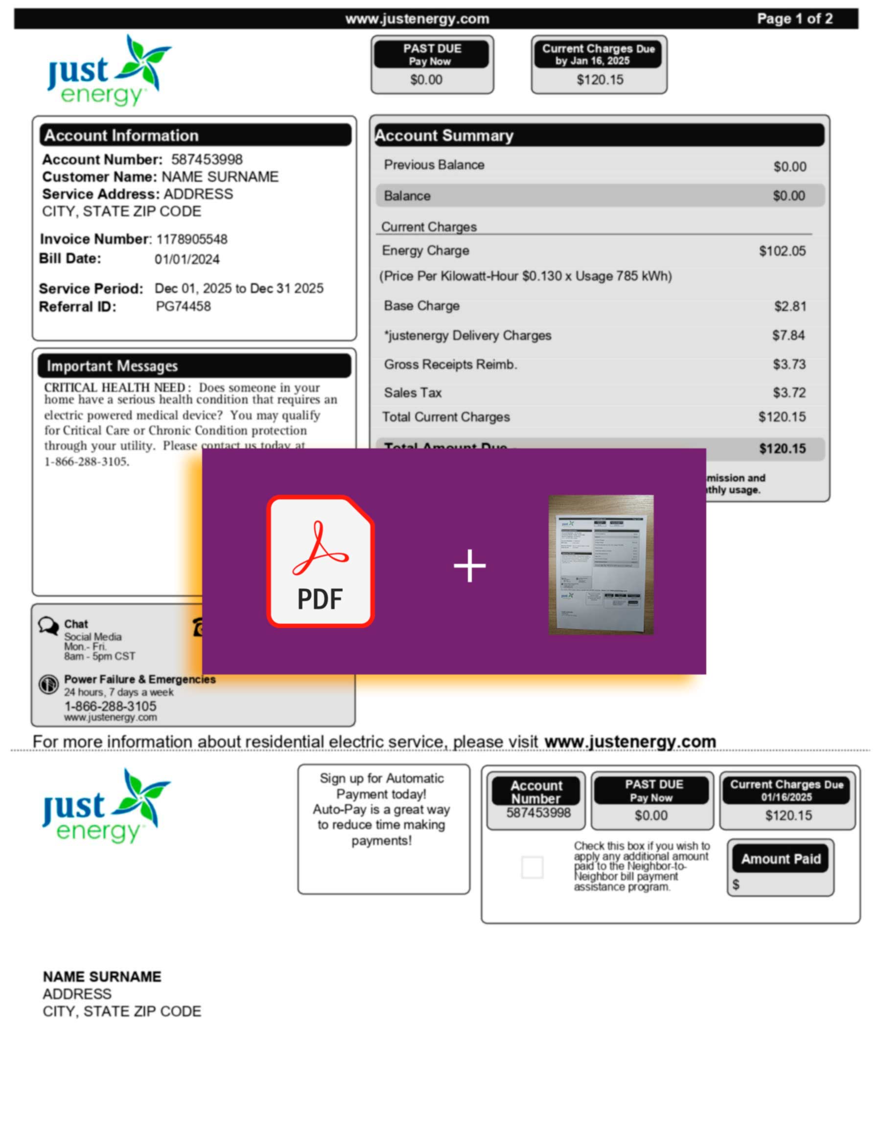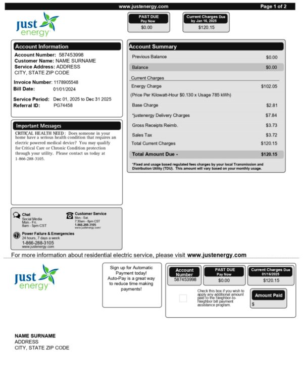 You’ll receive your files in PDF + JPEG formats, precisely aligned with the Just Energy USA layout. Each file includes editable fields for customer name, service address, statement date, billing cycle, and total amounts. Output is delivered in 300 DPI quality for pixel-perfect clarity. Enjoy free revisions until approved, delivery within 24 hours, secure checkout, and 24/7 customer support.