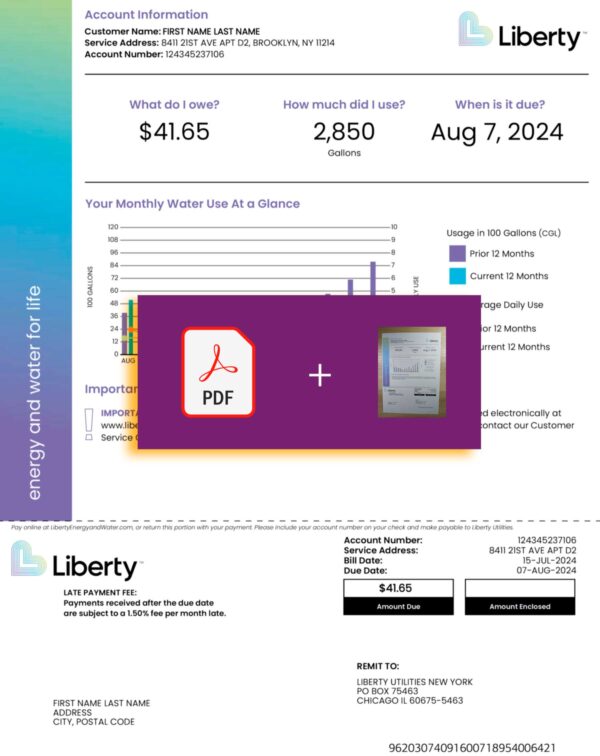This package includes JPEG or PDF + JPEG formats, professionally aligned with Liberty Utilities’ Kansas layout. Editable fields cover the customer name, service address, billing cycle, statement totals, and account information. Each file is produced in 300 DPI quality, includes free revisions until approval, a 24-hour turnaround time, and a secure checkout process. You also receive full 24/7 support from our team to ensure a seamless order experience.