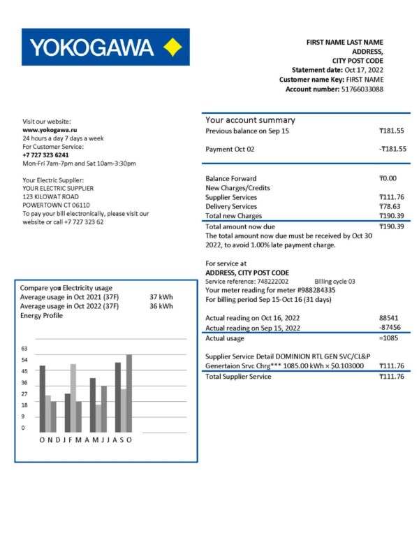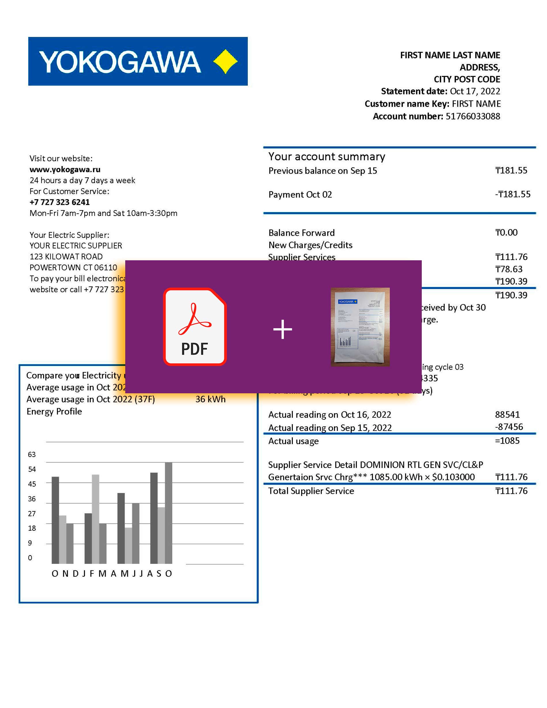 This file is suitable for all types of verifications. For example: for sites like paypal, payoner, paxful, binance, bets and poker web sites This Kazakhstan Yokogawa Electric Kazakhstan utility bill template can be used for: