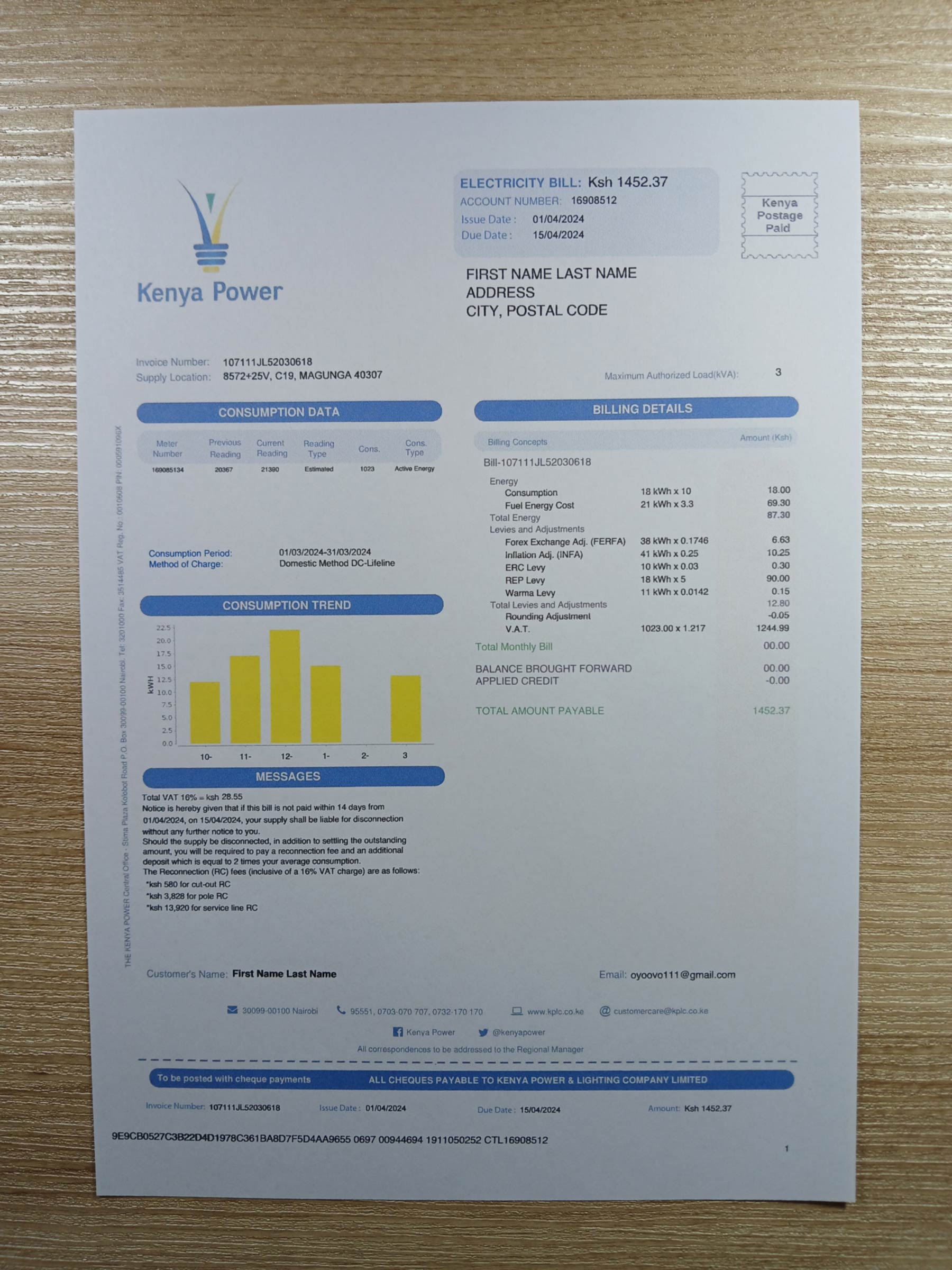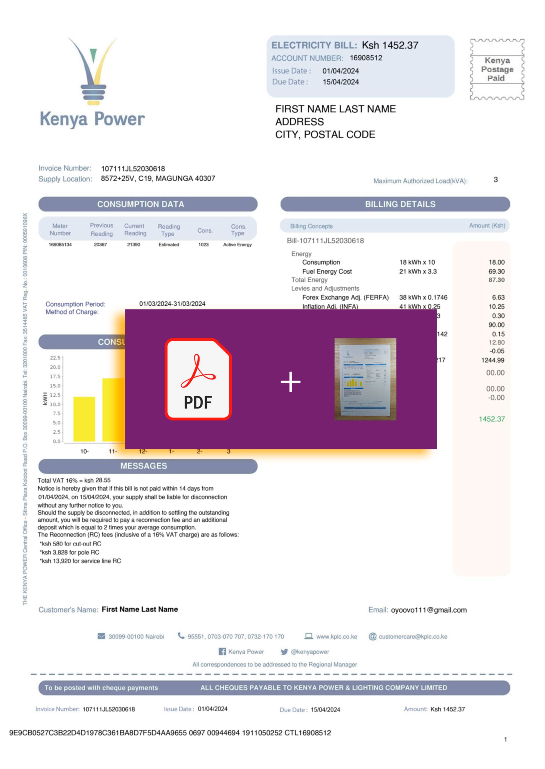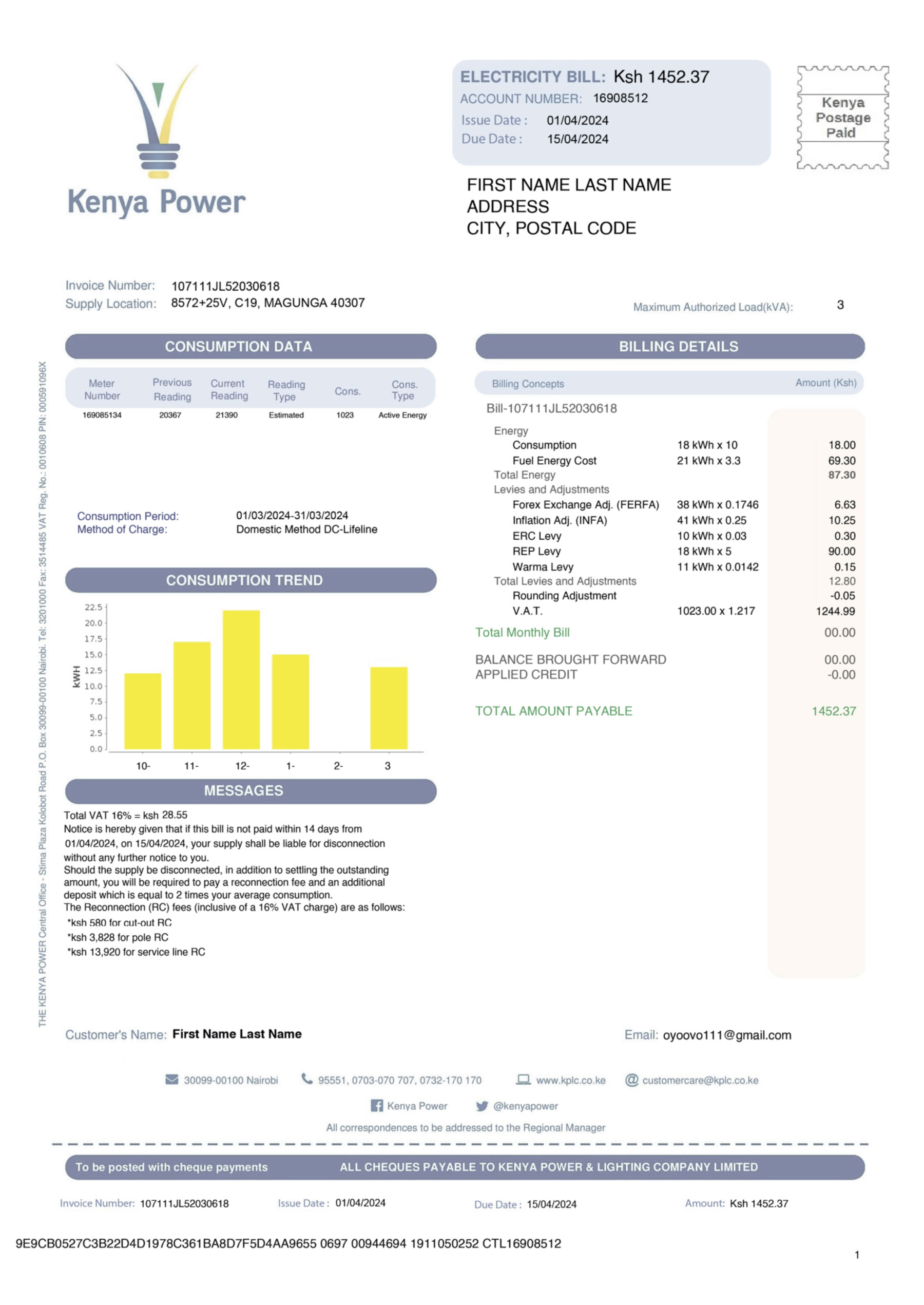 Your package includes both PDF and JPEG versions of the Kenya electric statement, crafted in crisp 300-DPI quality. The layout includes editable fields for customer name, address, billing period, meter readings, usage, and totals. Every order comes with free revisions until approved, secure checkout, a 24-hour turnaround, and dedicated 24/7 customer support.