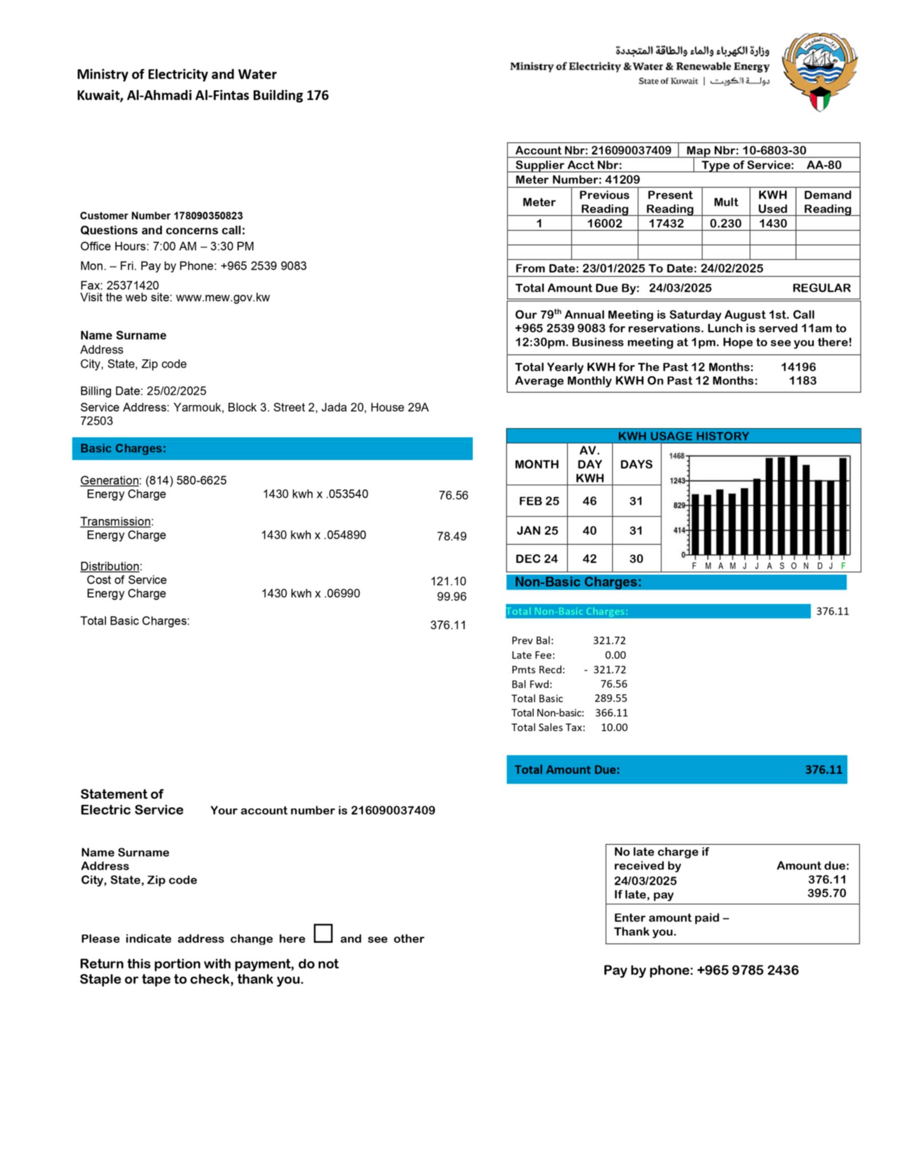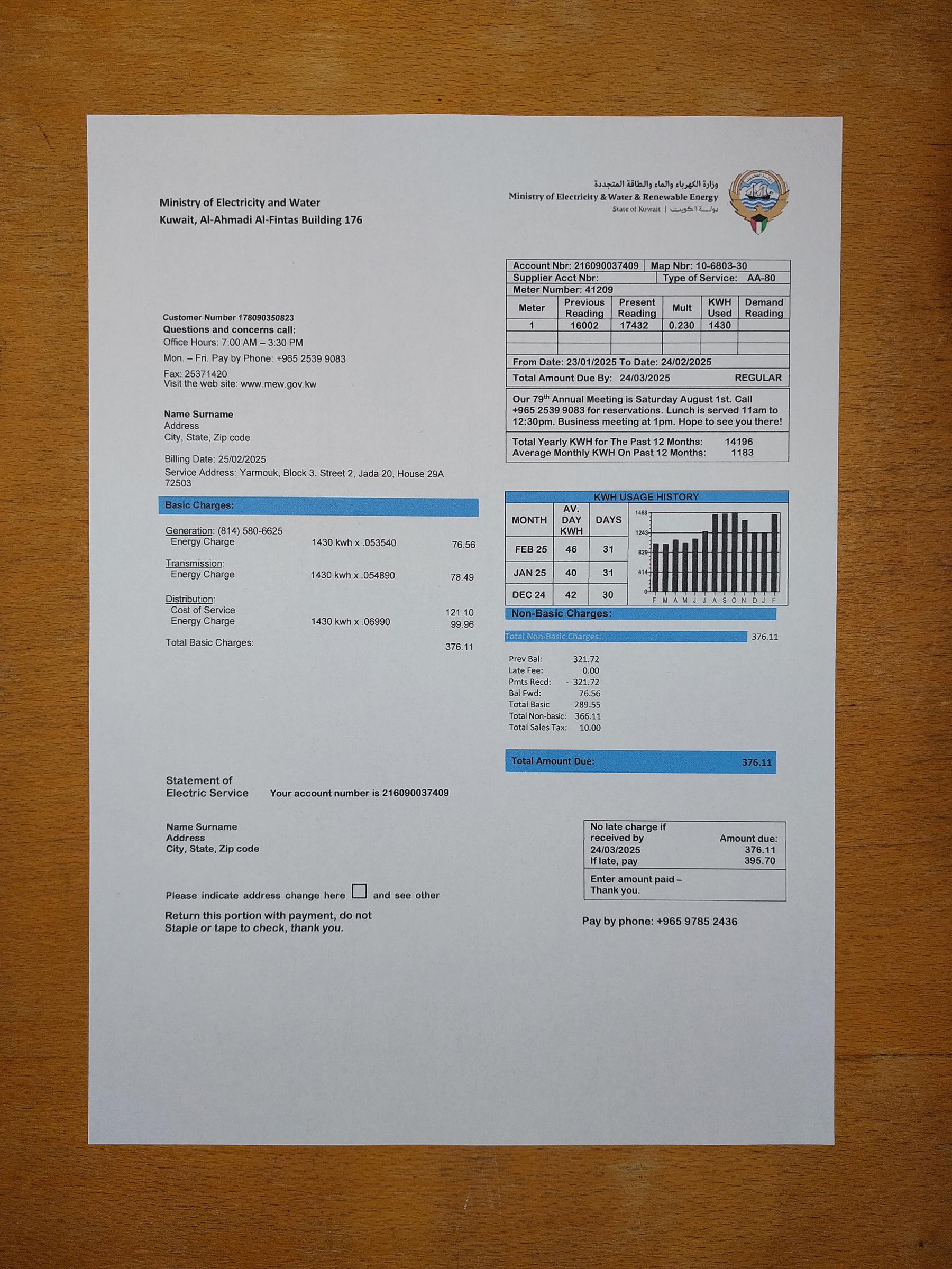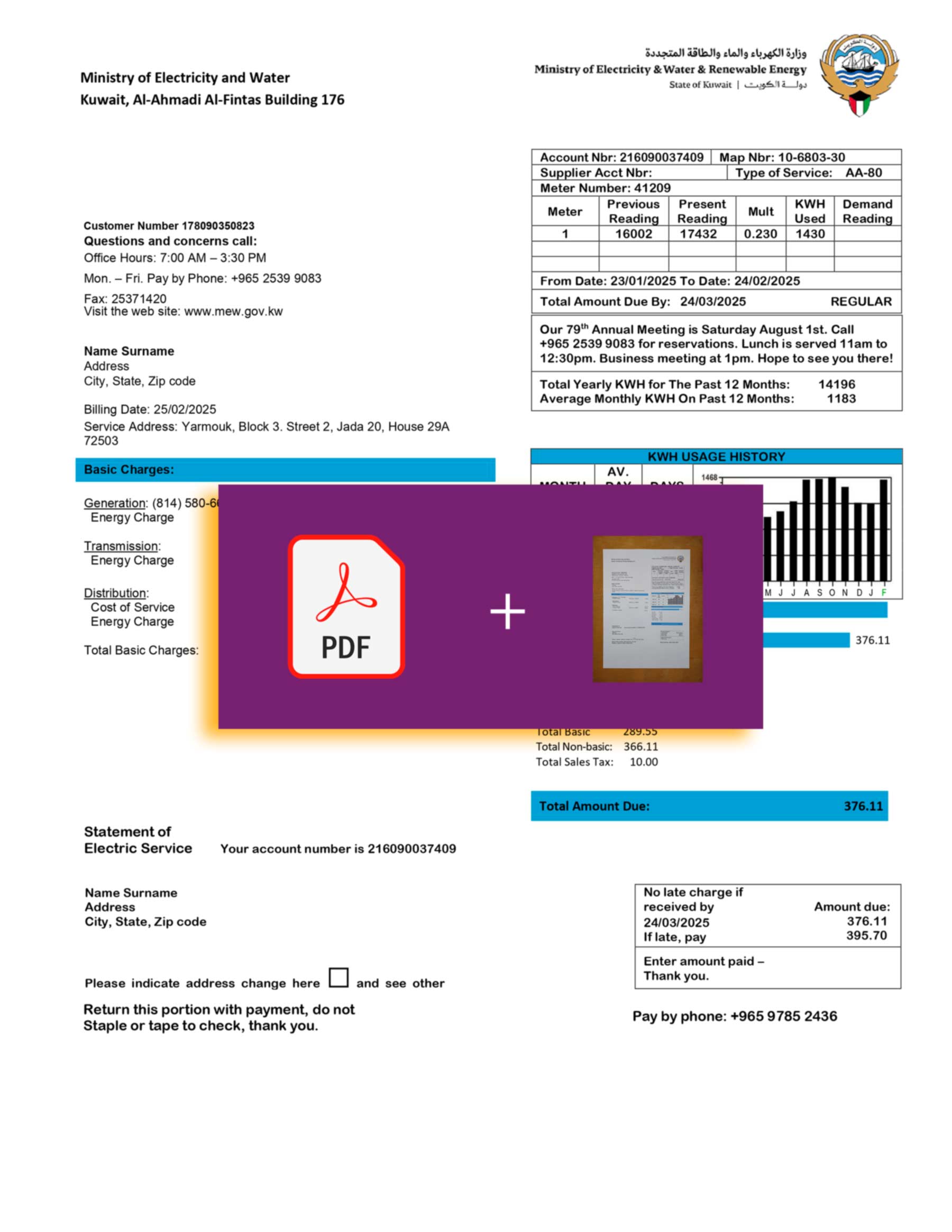 Your order includes both PDF and JPEG formats, rendered in high-quality 300 DPI. The file structure reflects Kuwait’s official electric bill layout, complete with editable fields such as name, address, billing date, consumption units, and payable amount. The package also provides free revisions until you approve the result, a guaranteed 24-hour turnaround, secure checkout, and around-the-clock customer support.