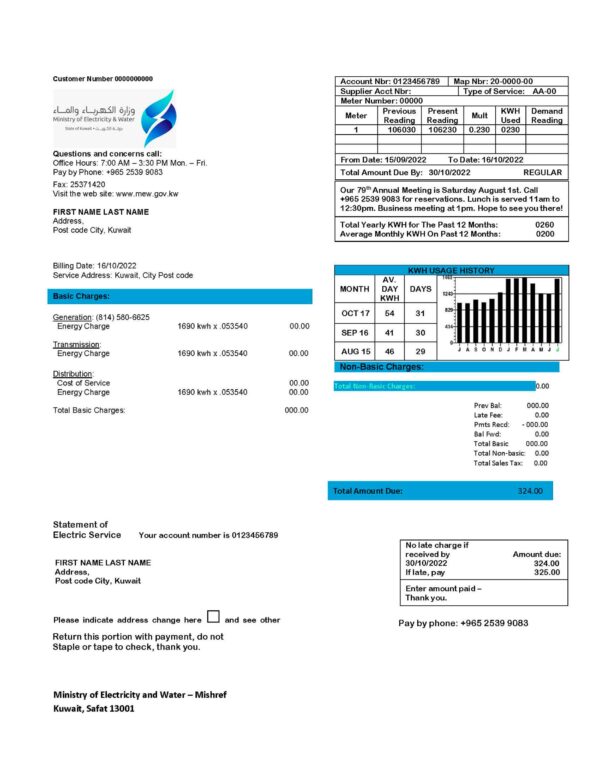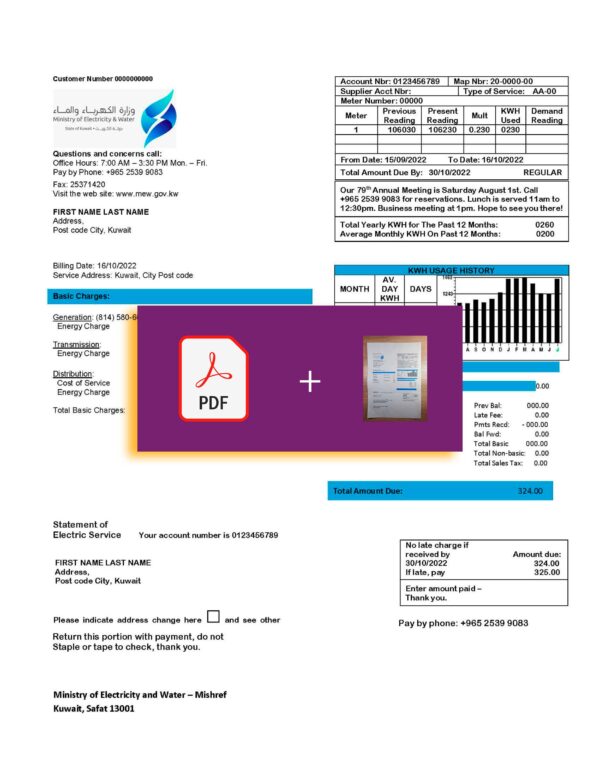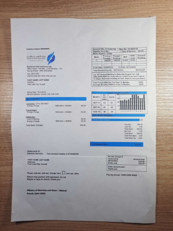 The package includes JPEG or PDF + JPEG files in high-resolution (300 DPI). The Kuwait electric statement comes with editable areas such as name, service address, account number, and billing period totals. Enjoy free revisions until approval, secure checkout, and dedicated 24/7 support. The layout aligns closely with official Kuwait electricity documentation for authentic visual presentation.