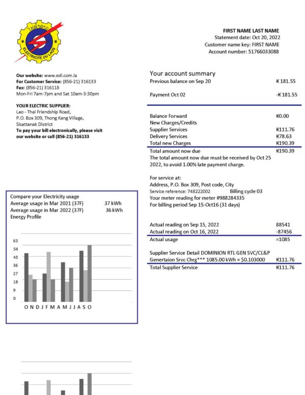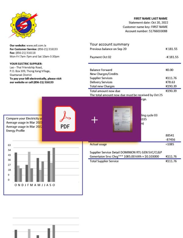 This file is suitable for all types of verifications. For example: for sites like paypal, payoner, paxful, binance, bets and poker web sites This Laos Electricite du Laos electricity utility bill template can be used for: