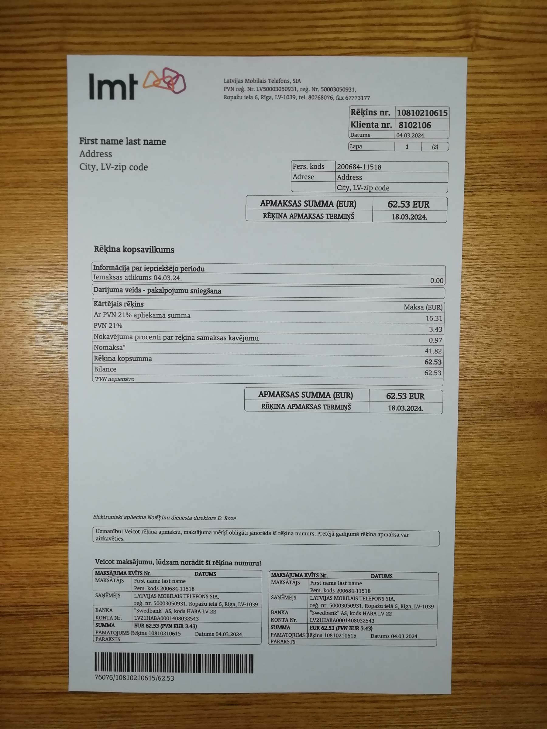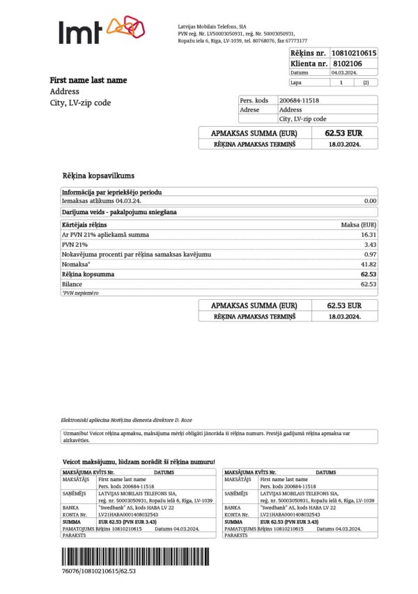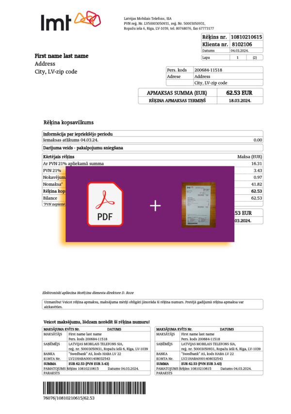 You’ll receive your file in JPEG or PDF + JPEG format, produced at 300 DPI for premium clarity. The layout follows IMT’s Latvian standards with editable sections for customer name, billing address, billing period, consumption totals, and charges. Enjoy free revisions until approval, 24-hour turnaround, secure payment processing, and continuous support to ensure your file meets professional requirements.