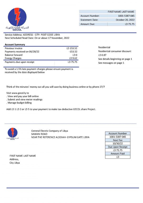 This editable Libya utility bill PDF provides a modern, standardized layout optimized for visual accuracy and clarity. Each document is crafted at 300 DPI for high-resolution output, ideal for POA/KYC verifications, compliance simulations, and UI/UX demonstrations. The Done-For-You approach ensures every field — from customer details to billing totals — is customized accurately, saving you time and maintaining document precision for business and presentation needs.