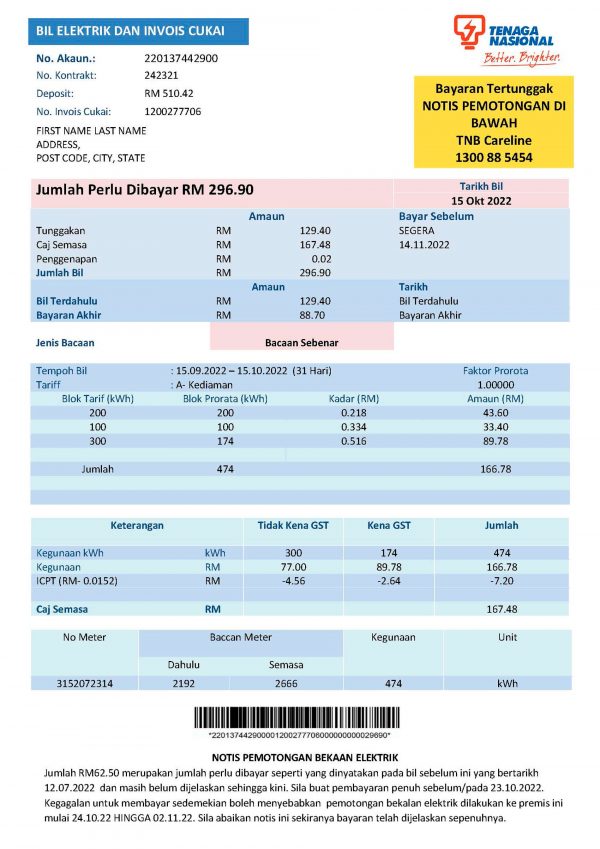 You can edit customer name, address, billing period, usage, and total amounts. The structure mirrors Malaysian utility standards and is compatible with major editing tools like Adobe Acrobat or Photoshop for easy customization without distortion.