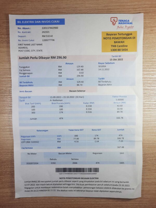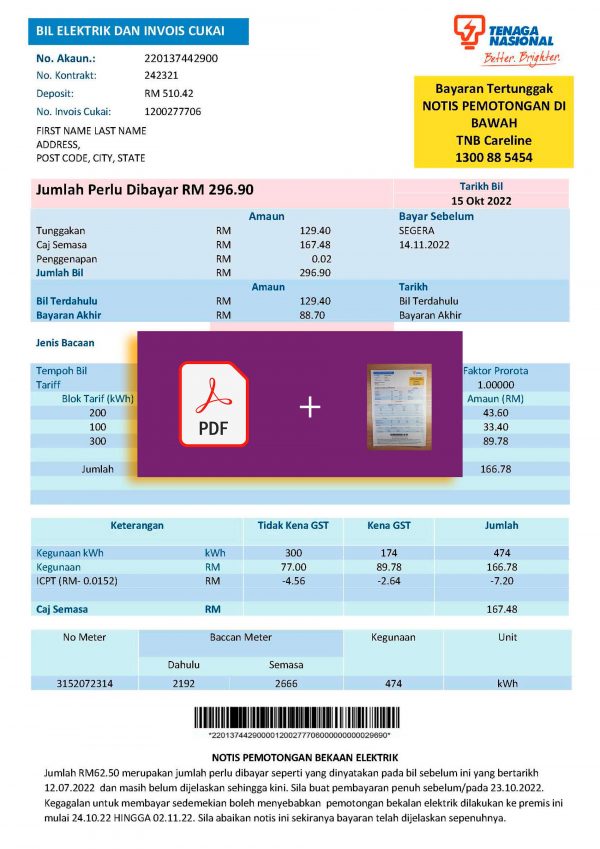 You can edit customer name, address, billing period, usage, and total amounts. The structure mirrors Malaysian utility standards and is compatible with major editing tools like Adobe Acrobat or Photoshop for easy customization without distortion.