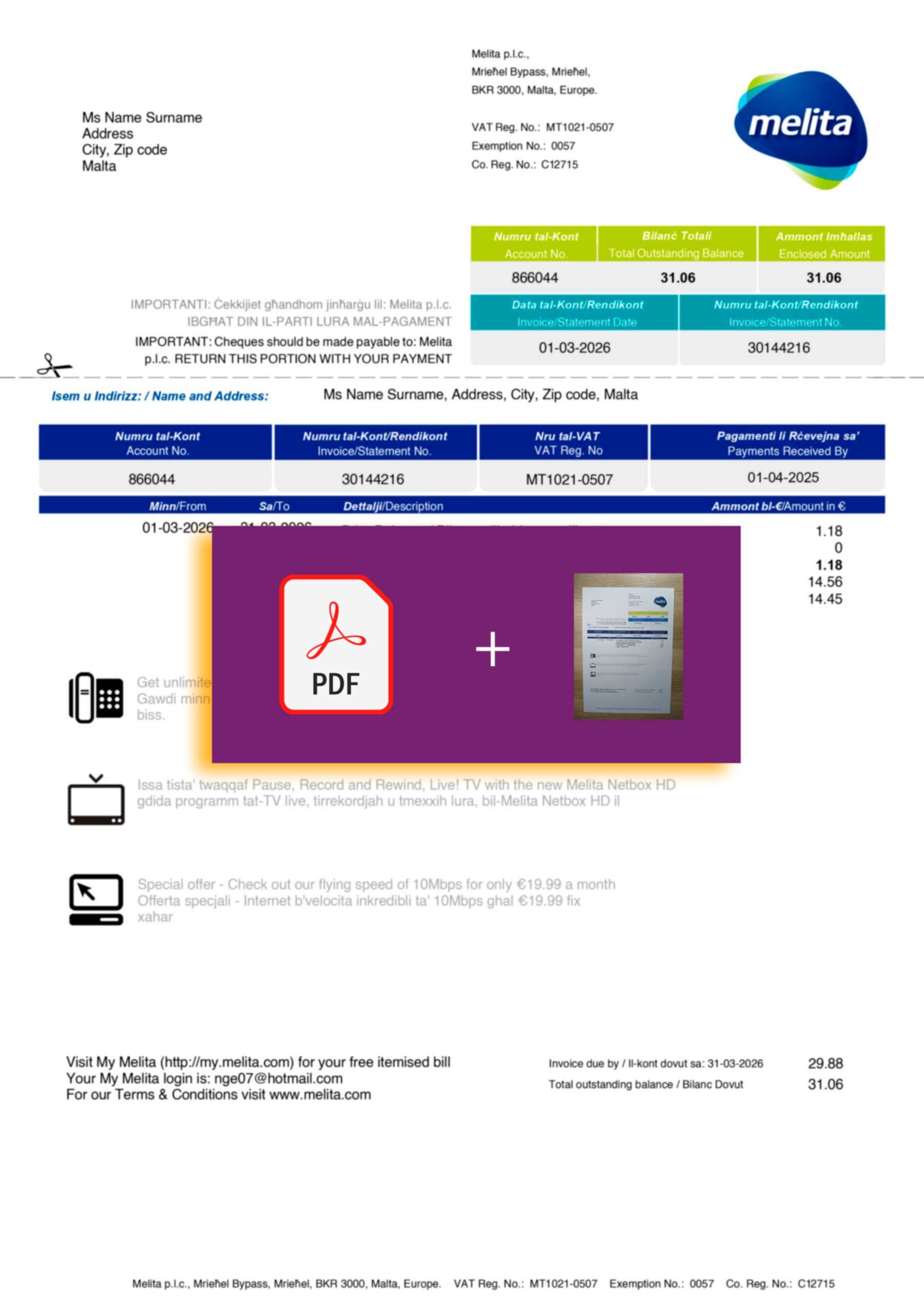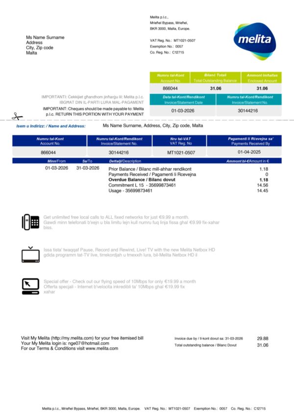 Your package includes high-resolution JPEG or PDF + JPEG files, built to replicate authentic Melita billing structures in Malta. Editable fields include the customer name, address, billing period, charges, and totals. Each order features free revisions until approval, guaranteed 24-hour turnaround, secure checkout, and continuous 24/7 customer support for full satisfaction.