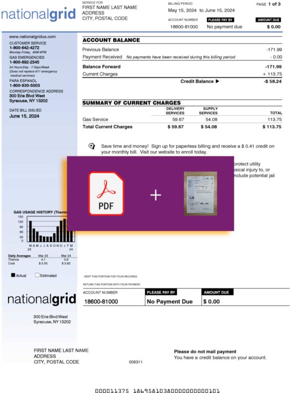 Your download package includes JPEG or PDF + JPEG formats built to match the National Grid Massachusetts statement layout. Editable fields include customer name, billing address, account number, billing cycle, usage details, and total charges. Every order comes with free revisions until approved, delivery within 24 hours, secure checkout, and 24/7 client support for peace of mind.