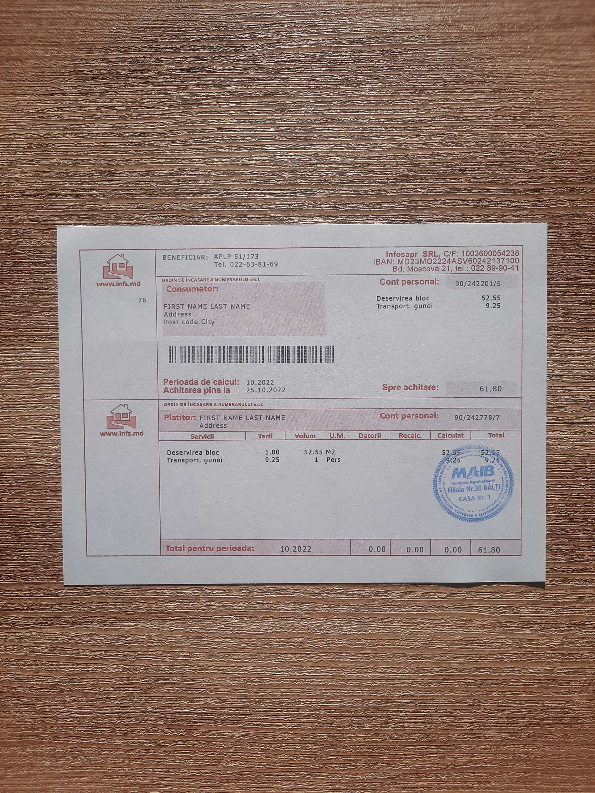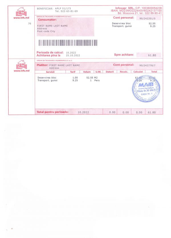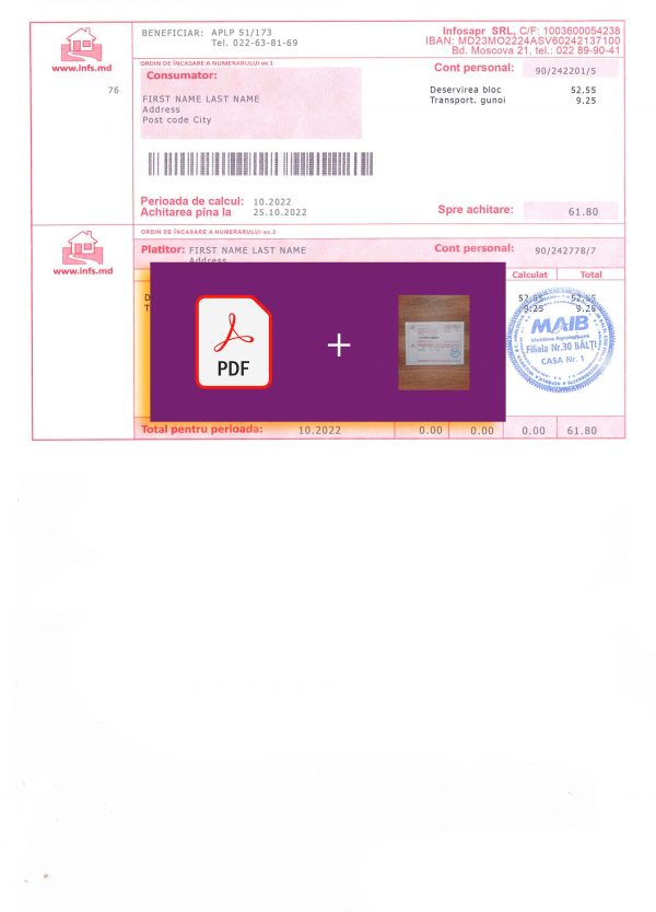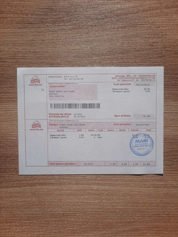 Those exploring this Moldova INFS utility layout often check out the Moldova Gas Utility Bill Template for a realistic energy-based format or discover the Lithuania Ignitis Utility Bill Template for a similar regional proof of address design. Both offer editable structures that ensure high visual accuracy and smooth UX simulation.