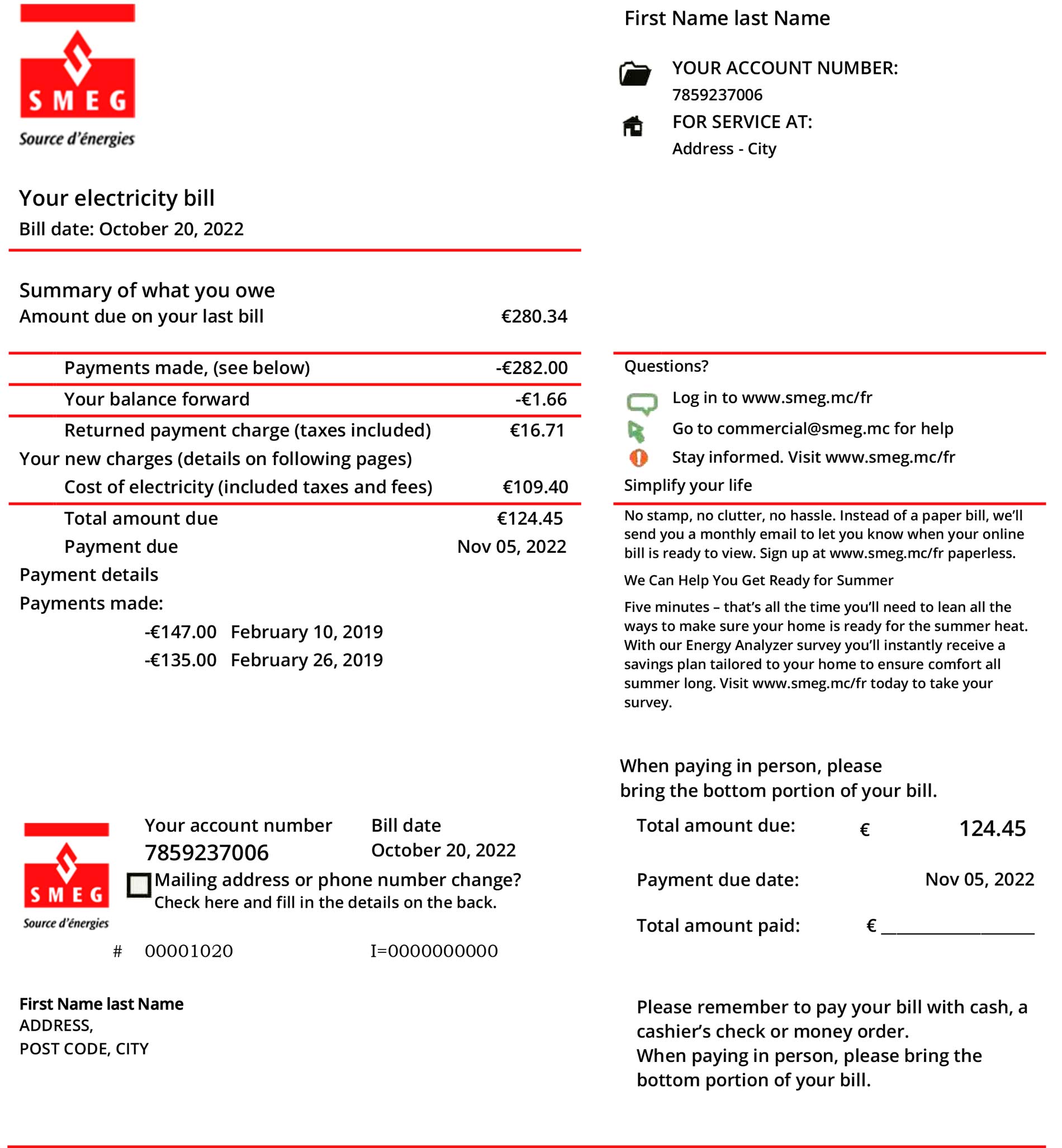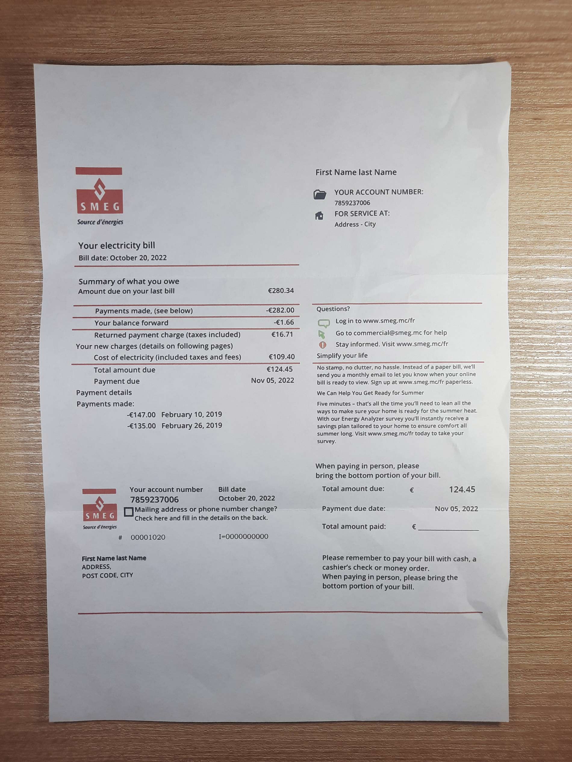 This Monaco utility bill maker offers a ready-to-edit, high-resolution statement template optimized for both digital and print use. The layout follows the standard structure of Monaco’s utility documents, including editable fields for user information, billing cycle, and total amounts. Built with a Done-For-You approach, it’s ideal for professionals needing realistic mockups for POA/KYC verification, UI design testing, and document training environments without the need for manual formatting.