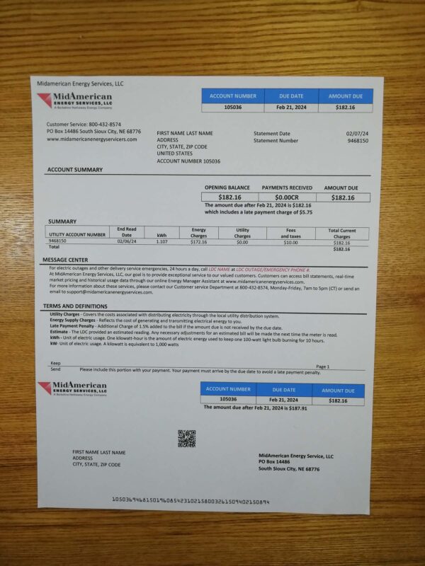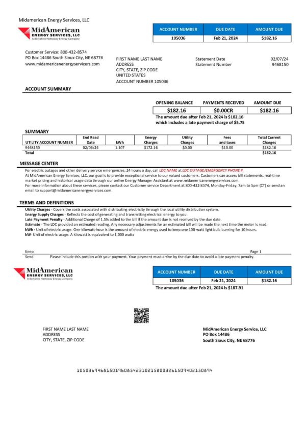 The MidAmerican Energy Bill Template – 2025 Edition for Nebraska is a realistic, editable electric utility statement designed to match the professional layout of genuine MidAmerican Energy documents. Produced at 300 DPI, it’s ideal for proof-of-address (POA) simulations, KYC verification demos, or UX design and compliance testing. The Done-For-You approach ensures that all data fields are customized by professionals — you simply provide details, and we handle the rest with accuracy and consistency.