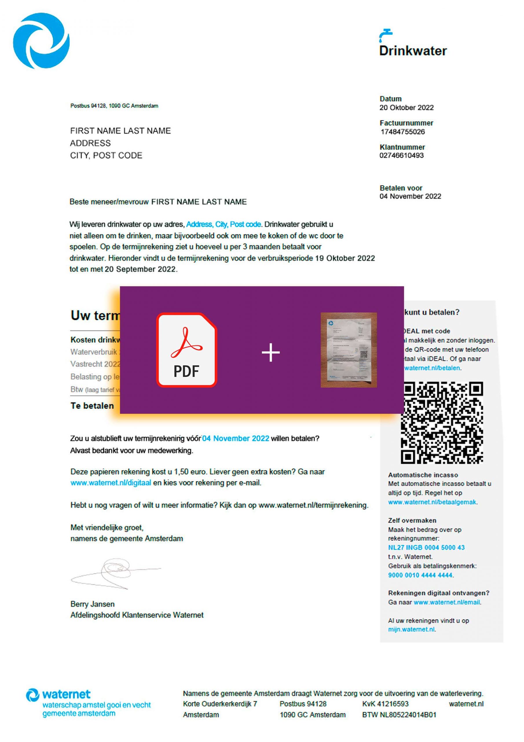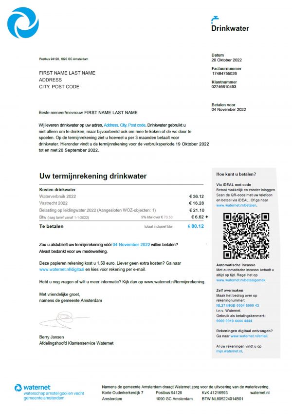 You can edit name, address, billing period, consumption, and totals. The layout adheres to realistic Dutch water billing standards and is compatible with all major PDF editors or Photoshop for precision customization.
