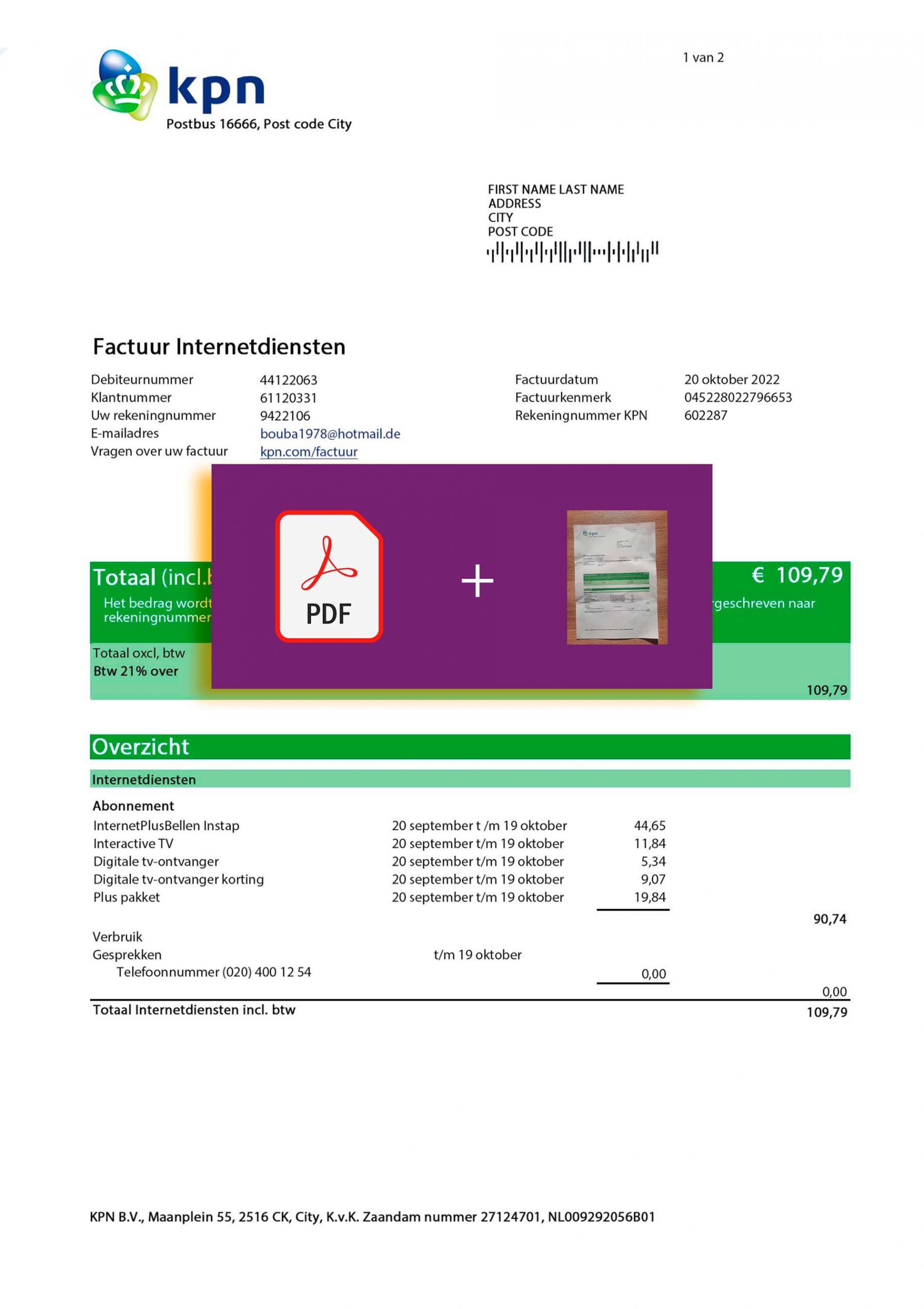 You can edit all key fields — name, address, billing period, usage details, and totals — while keeping the authentic KPN design intact. Files are fully compatible with Adobe Acrobat and Photoshop for professional customization without loss of layout integrity.