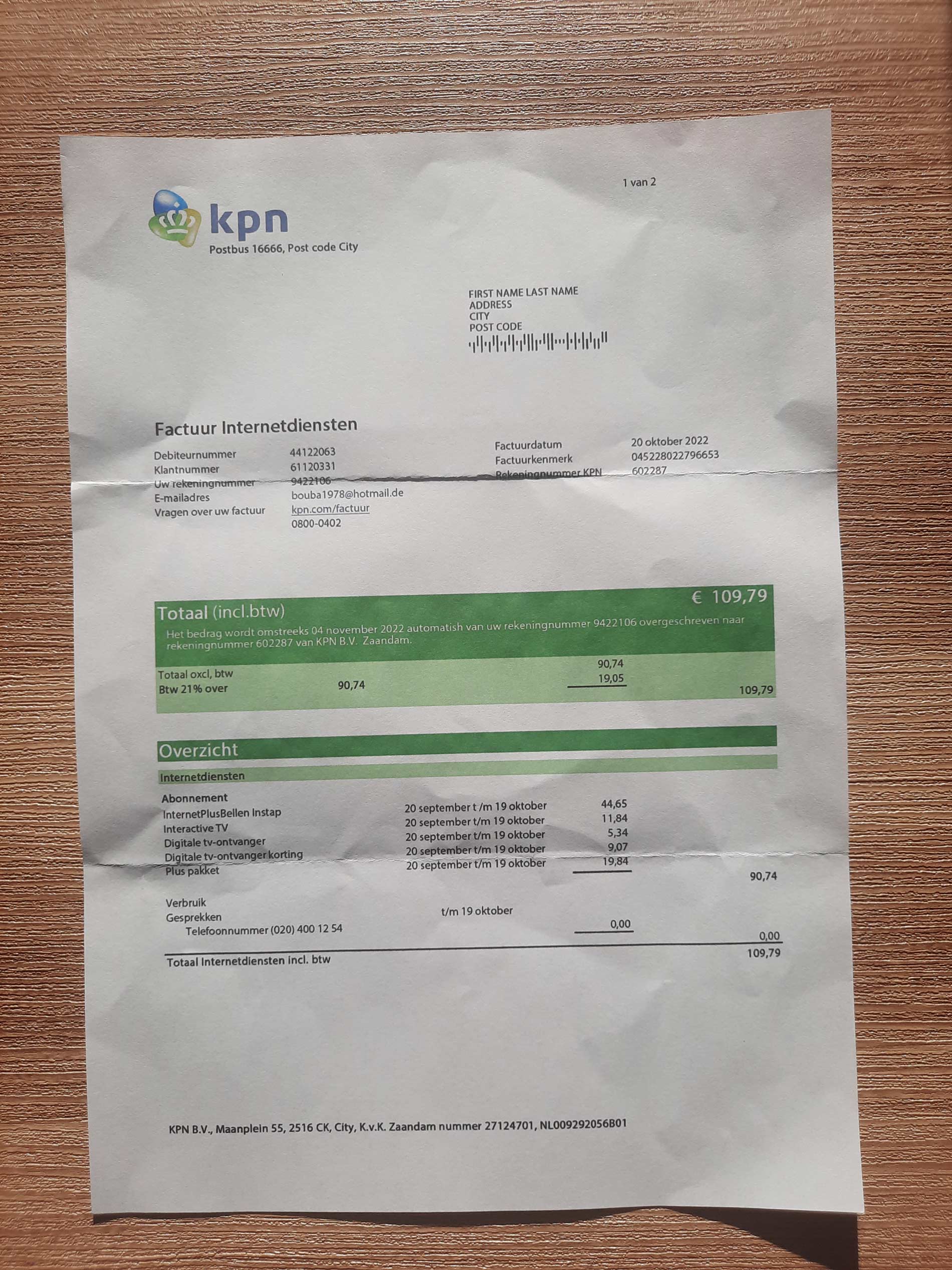 Your purchase includes JPEG or PDF + JPEG formats, with editable text fields such as account name, service address, billing period, and payment details. The layout matches KPN’s authentic telecom bill format in the Netherlands. You’ll receive free revisions until approval, 24-hour delivery, secure payment handling, and round-the-clock support from our design team to ensure perfect alignment with your project needs.