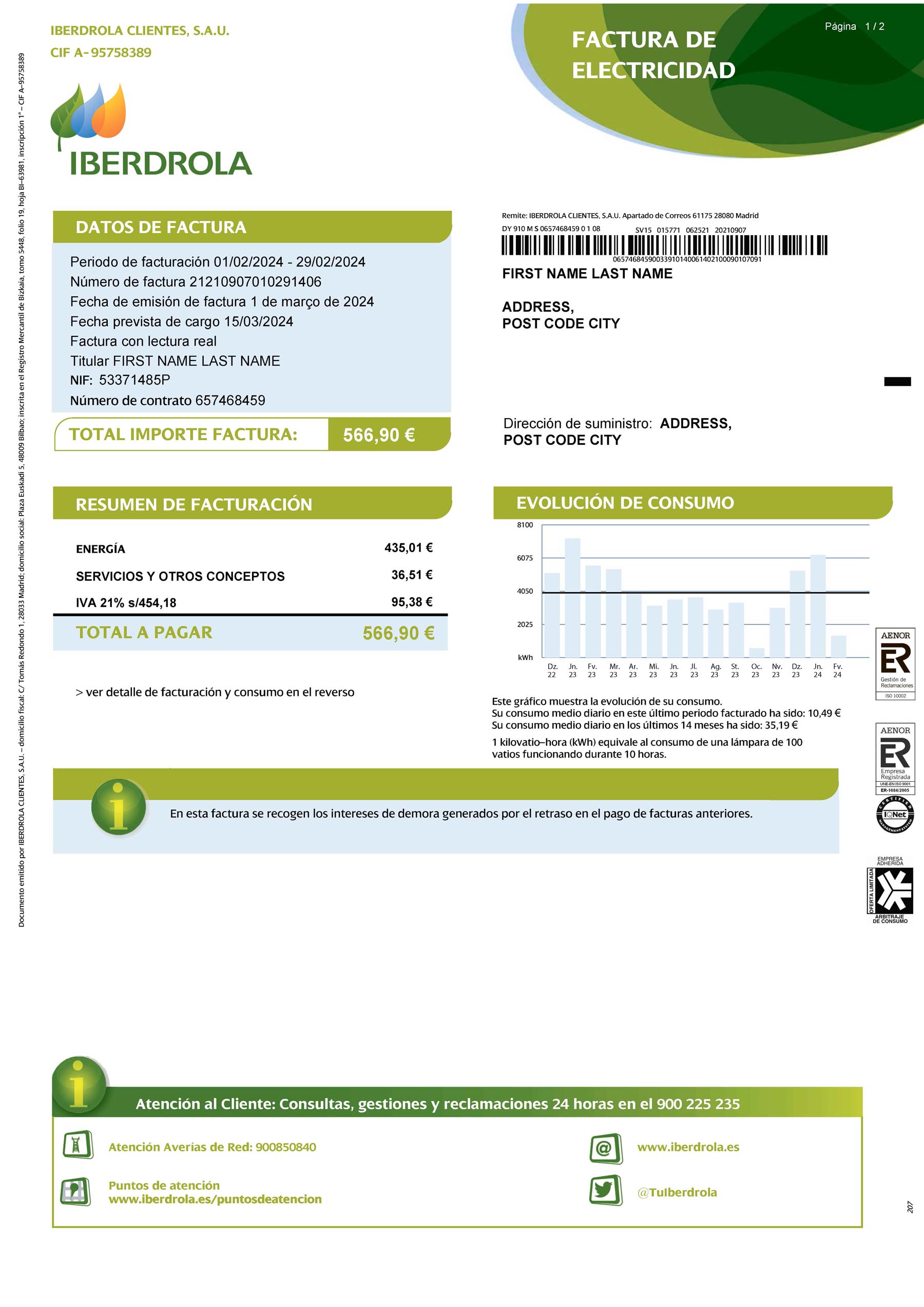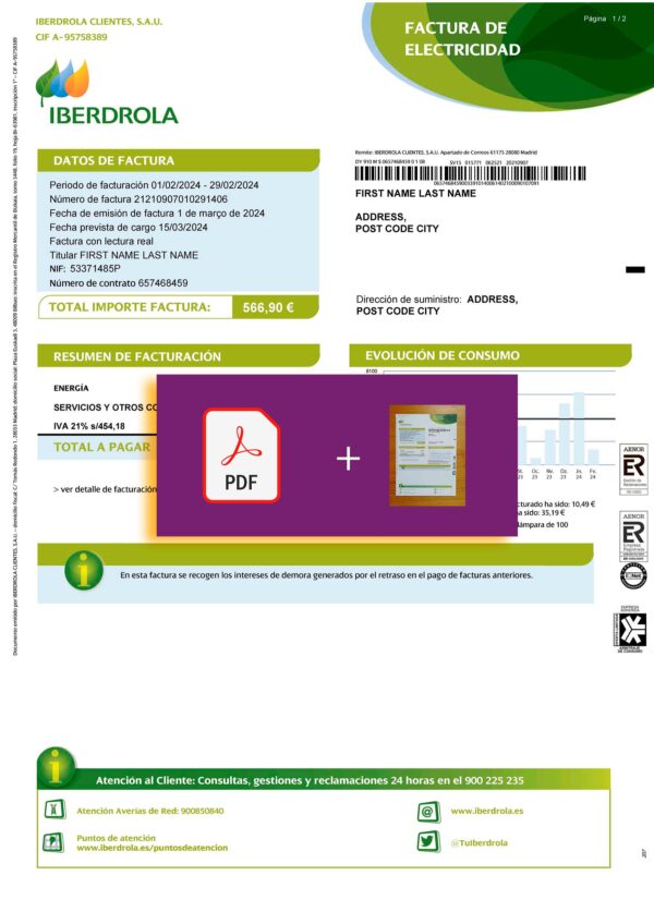 You’ll receive JPEG or PDF + JPEG files in 300 DPI, preserving the authentic Iberdrola layout used across Portugal. Editable fields include customer name, billing address, meter data, energy consumption, and total balance. Free revisions are included until final approval, and all orders are processed through secure checkout. Delivery is guaranteed within 24 hours, with 24/7 email support available for follow-up edits or questions.