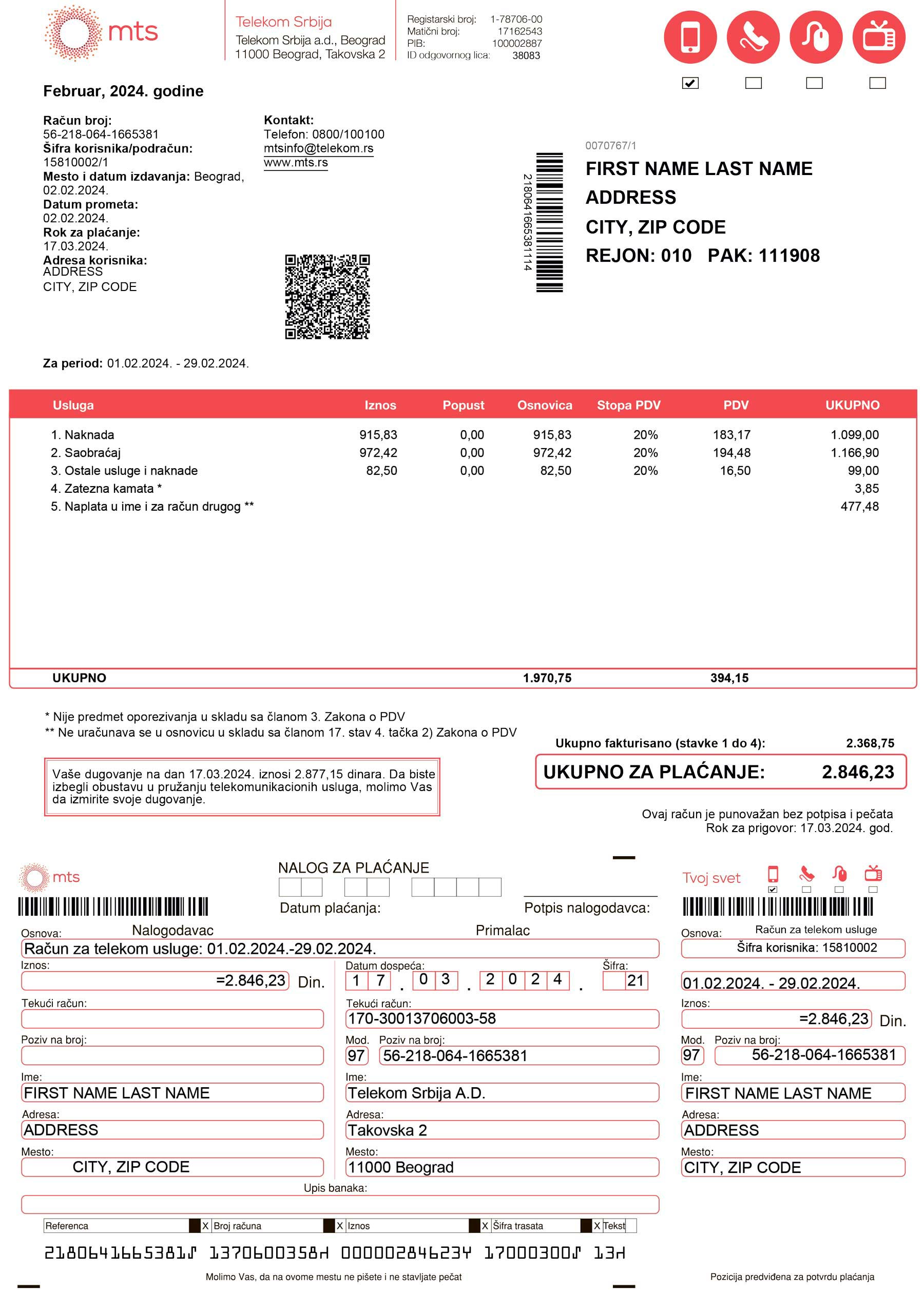 This MTS phone bill mockup serves as an editable sample for interface testing, documentation, and prop workflows. Discover the EPS electricity mockup and the Vodopek utility mockup to compare header layouts and data grids.