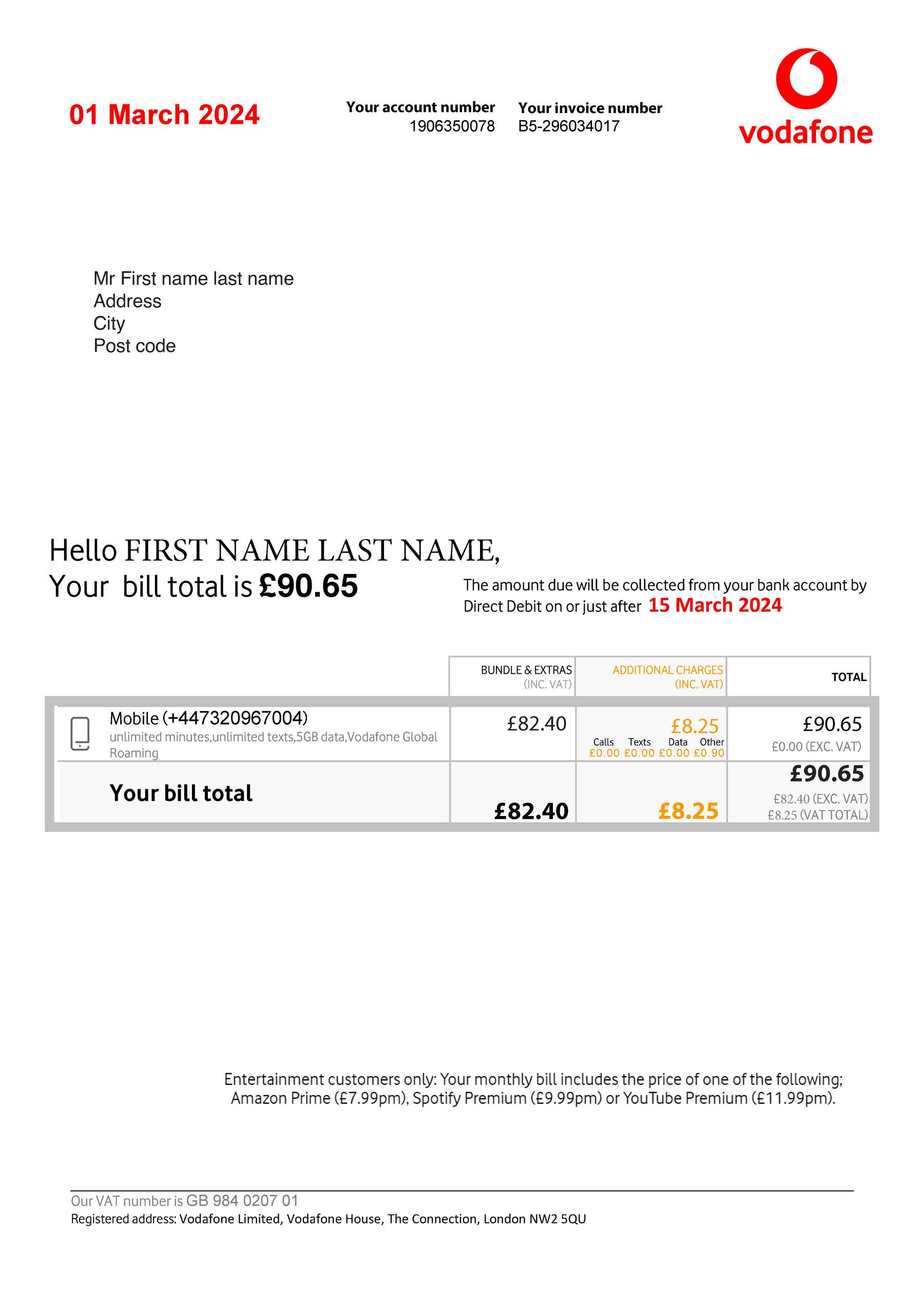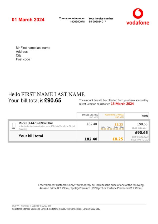Discover how this Vodafone UK utility layout aligns with telecom-style formats like the Ireland Meteor bill and the British Gas sample, offering smooth consistency in digital verification sets.