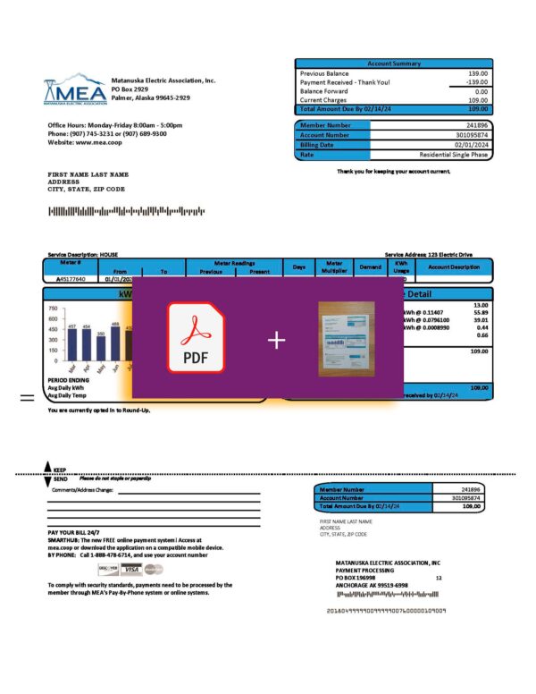 Your order includes JPEG or PDF + JPEG formats, both delivered in crisp 300 DPI resolution. The layout is fully aligned with MEA’s authentic Alaska format. Editable fields cover customer name, address, meter data, usage summary, and total due amounts. Enjoy free revisions until approved, guaranteed 24-hour turnaround, secure checkout, and dedicated 24/7 customer support for a seamless experience from start to finish.