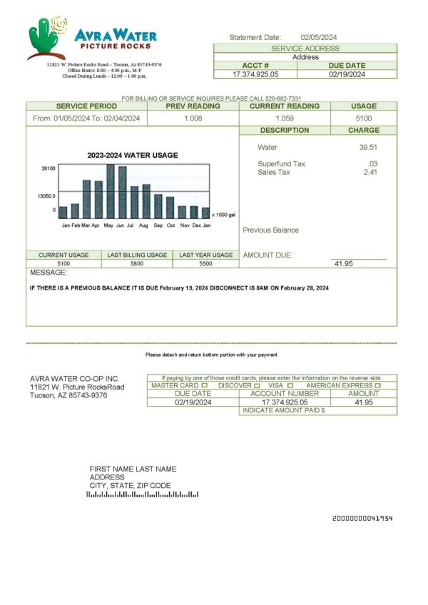 The Avra Water bill example offers a minimal, clean design similar to the Tucson Electric Power format and the Utility Smart layout, perfect for proof-of-address scenarios.