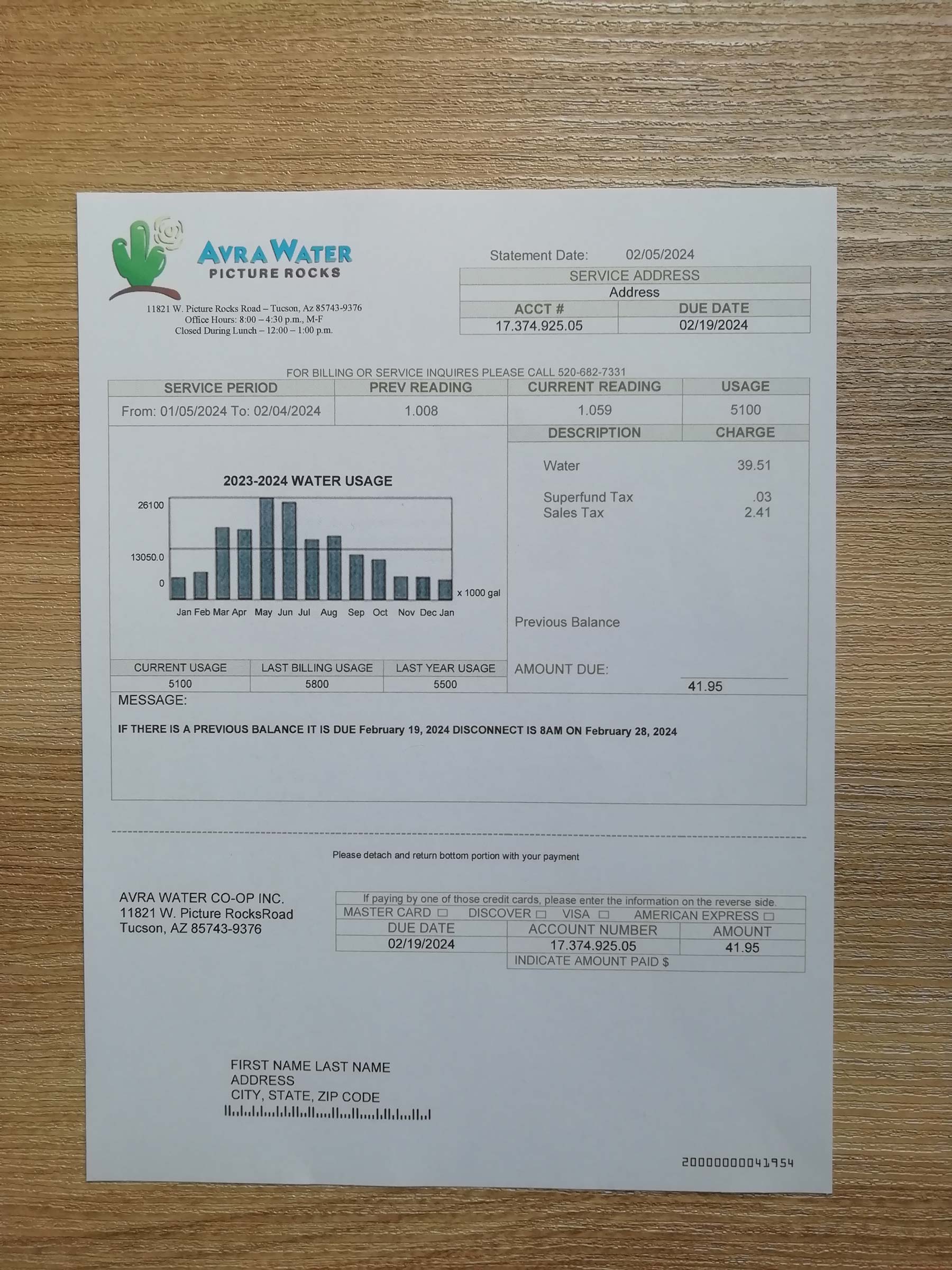 All editable elements include name, address, billing dates, usage readings, and total amounts. The Arizona-specific design retains the genuine Avra Water layout, compatible with Adobe Photoshop and standard PDF editors at full 300 DPI resolution.