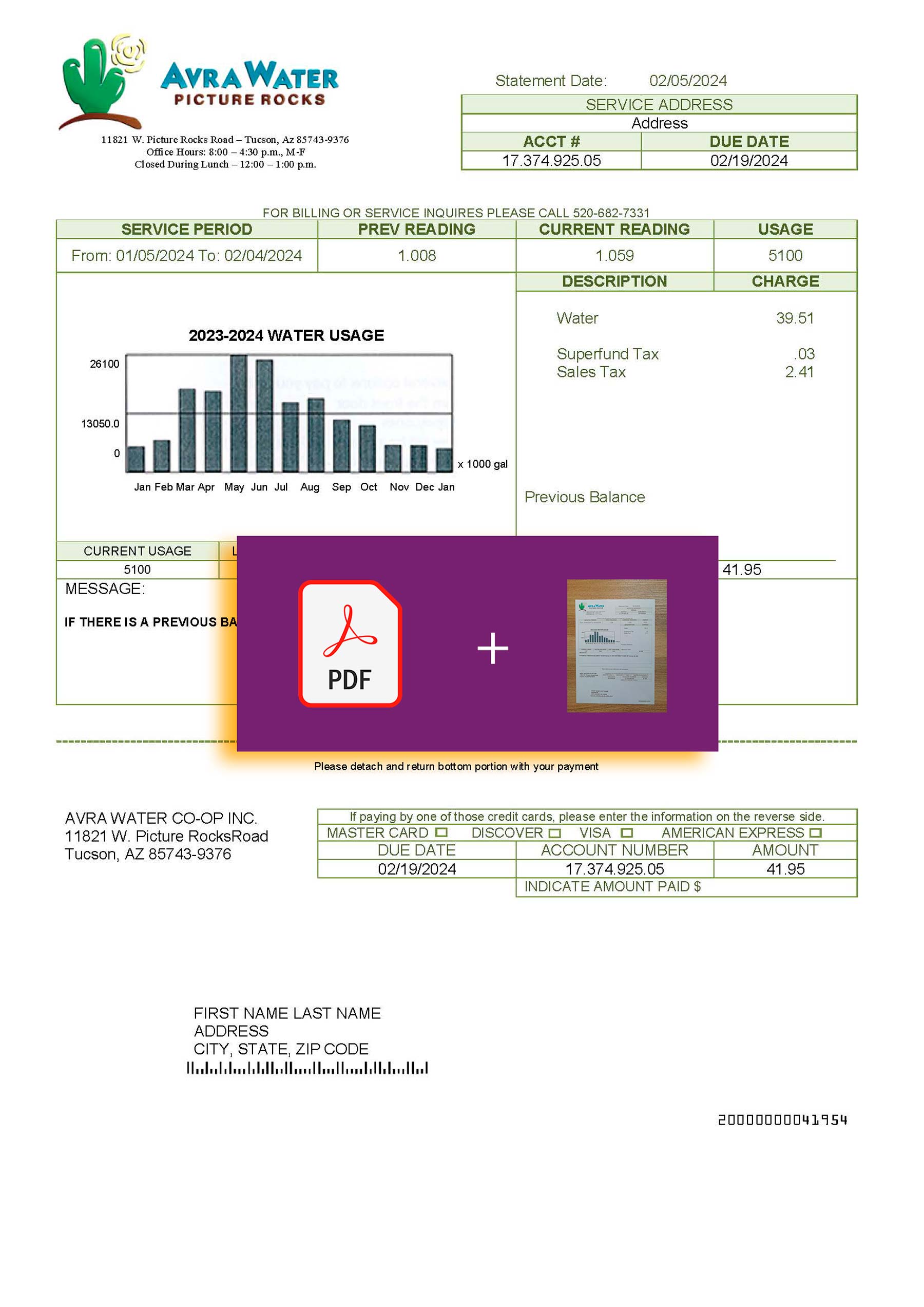 You’ll receive your file in JPEG or PDF + JPEG formats, both optimized for crisp 300 DPI clarity. The design reflects the original Avra Water layout used in Arizona, with editable areas for customer name, address, billing details, water usage, and payment totals. Each order includes free revisions until approval, 24-hour delivery, secure checkout, and 24/7 assistance for a smooth experience from start to finish.