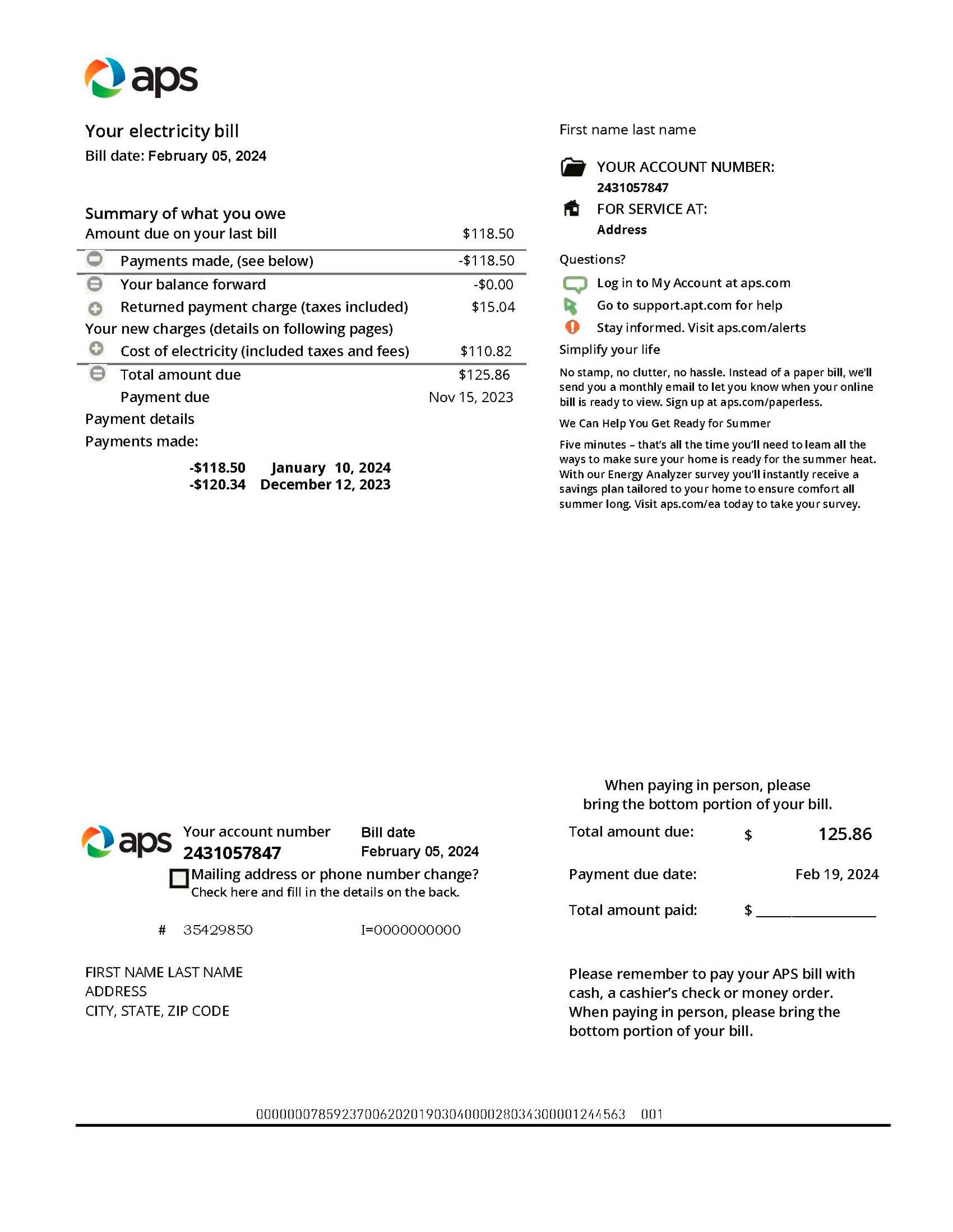 This editable Arizona Public Service (APS) electric bill template is a precise, high-resolution (300 DPI) replica of the authentic Arizona layout, designed for professional applications such as UI/UX visualization, compliance testing, and proof-of-address (POA) simulations. Each section, including billing cycle, service address, meter readings, and total amounts, is fully customizable. The Done-For-You workflow ensures that your file arrives polished and ready for use, with no manual editing required on your part.