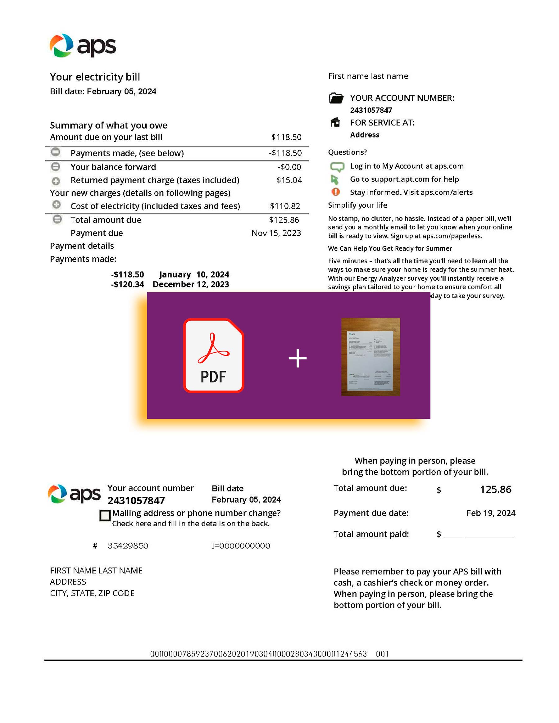 You’ll receive your APS Electric Bill Template in JPEG or PDF + JPEG formats, aligned with APS’s Arizona layout. All text areas are editable—customer name, billing address, usage details, and totals—while the design maintains original professional formatting. The package includes free revisions until approval, 24-hour turnaround, secure payment, and 24/7 customer support for full reliability and satisfaction.
