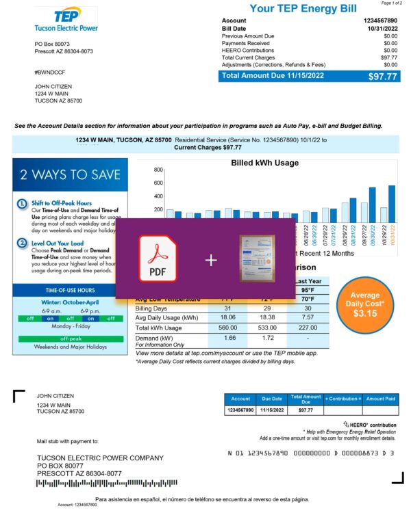 Photographed version of editable Arizona Tucson electric power (TEP) invoice