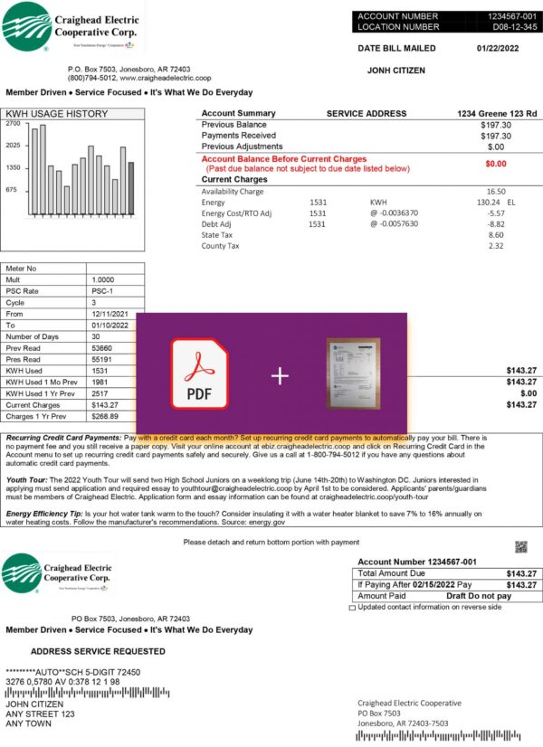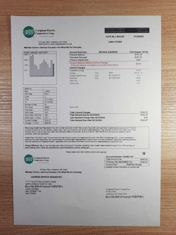 This editable Craighead Electric utility bill template replicates the professional design used by Arkansas cooperatives. It’s a 300 DPI high-resolution file created for realistic presentation in documentation, UX/UI prototypes, compliance reviews, and KYC/POA simulations. Each field is customizable — including name, billing address, account number, usage data, and total amount — all handled through a Done-For-You workflow. No manual editing is required; our team ensures the final file looks accurate, polished, and ready for use.
