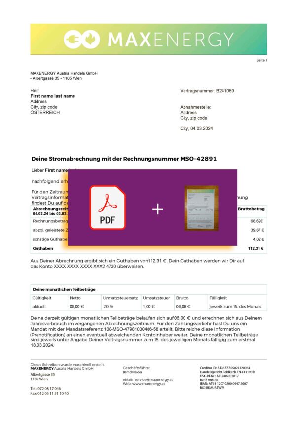Package includes editable PDF and JPEG files in high-resolution 300 DPI format. The layout aligns with MaxEnergy’s Austrian electricity statement design, featuring editable fields such as customer name, supply address, billing period, meter readings, energy consumption, and total charges. Every order includes free revisions until final approval, 24-hour delivery, encrypted checkout, and continuous 24/7 support.