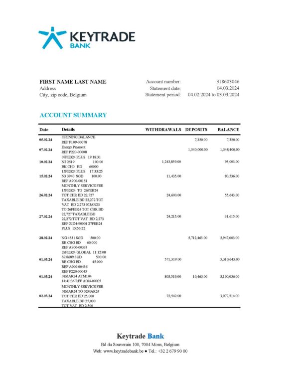 This editable Keytrade Bank statement template for Belgium is a 2025-format document designed with professional accuracy and detail. Delivered in high resolution (300 DPI), it replicates the authentic layout of a modern Belgian banking statement, including editable sections for account holder details, transaction history, balances, and summary totals. Ideal for designers, developers, and compliance professionals, it supports lawful proof-of-address and KYC demonstrations while maintaining a Done-For-You workflow—no editing skills required.