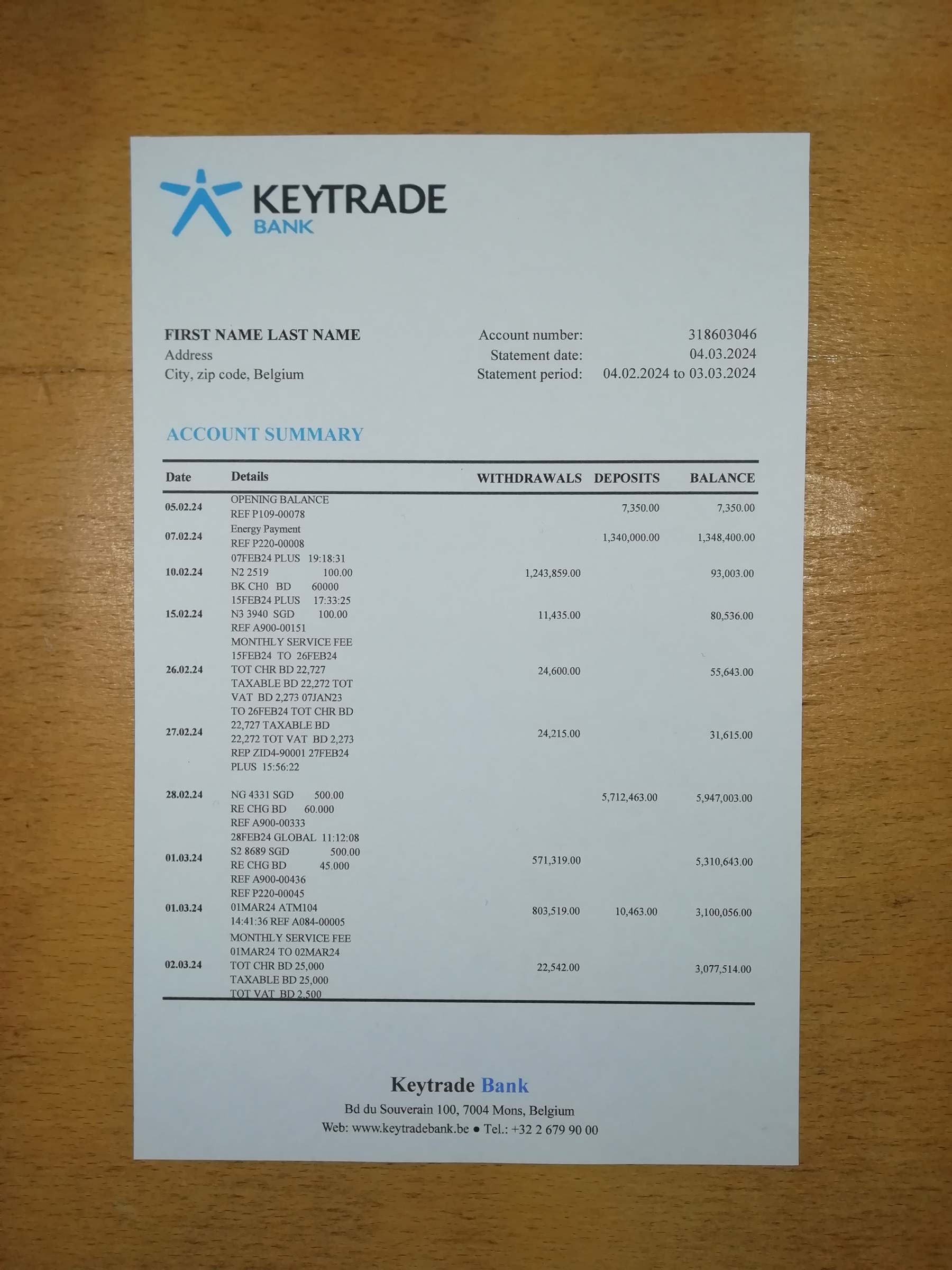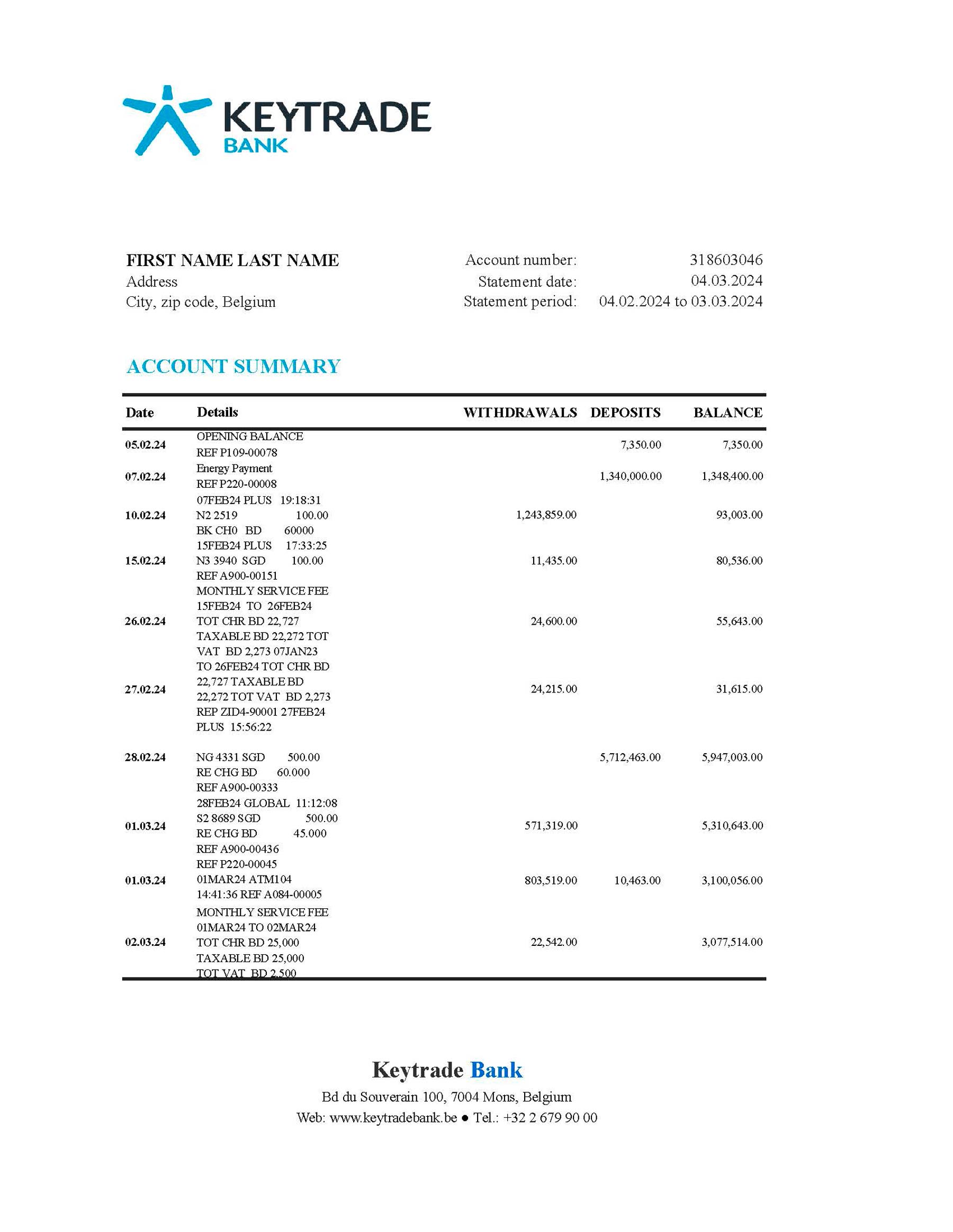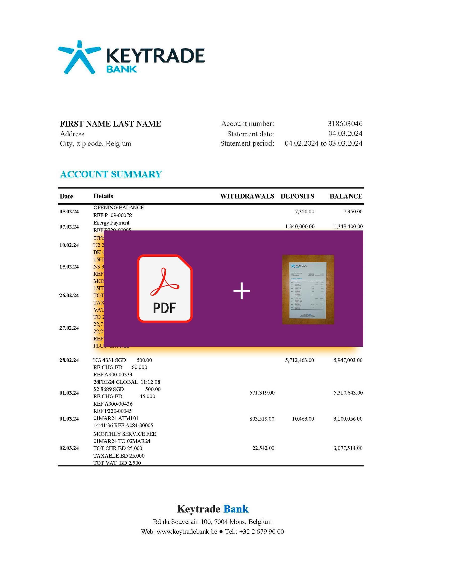 You can modify key fields such as customer name, address, statement dates, transaction lines, and totals. The design preserves the authentic Belgian Keytrade Bank format and is compatible with Photoshop and PDF editors for accuracy and control.
