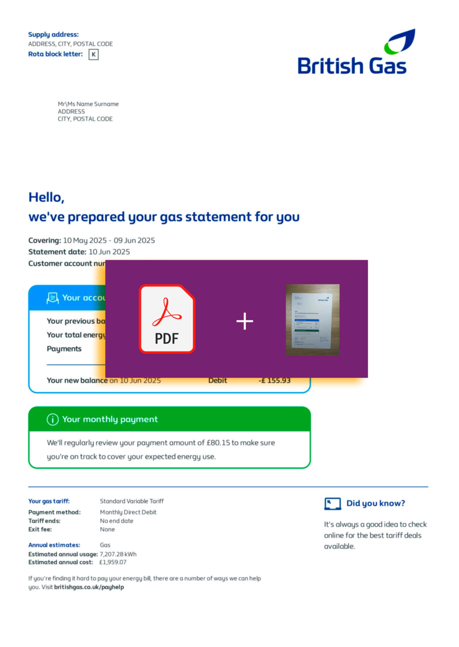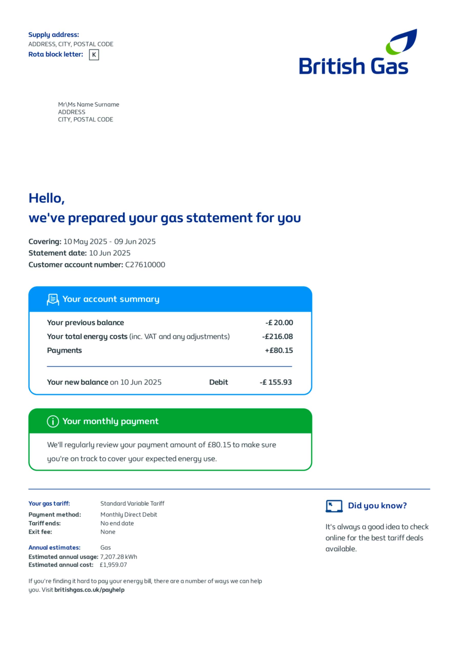 This British Gas sample complements energy-focused layouts such as the SSE Energy bill and the E.ON Electricity template, both optimized for proof-of-address and editable PDF customization.
