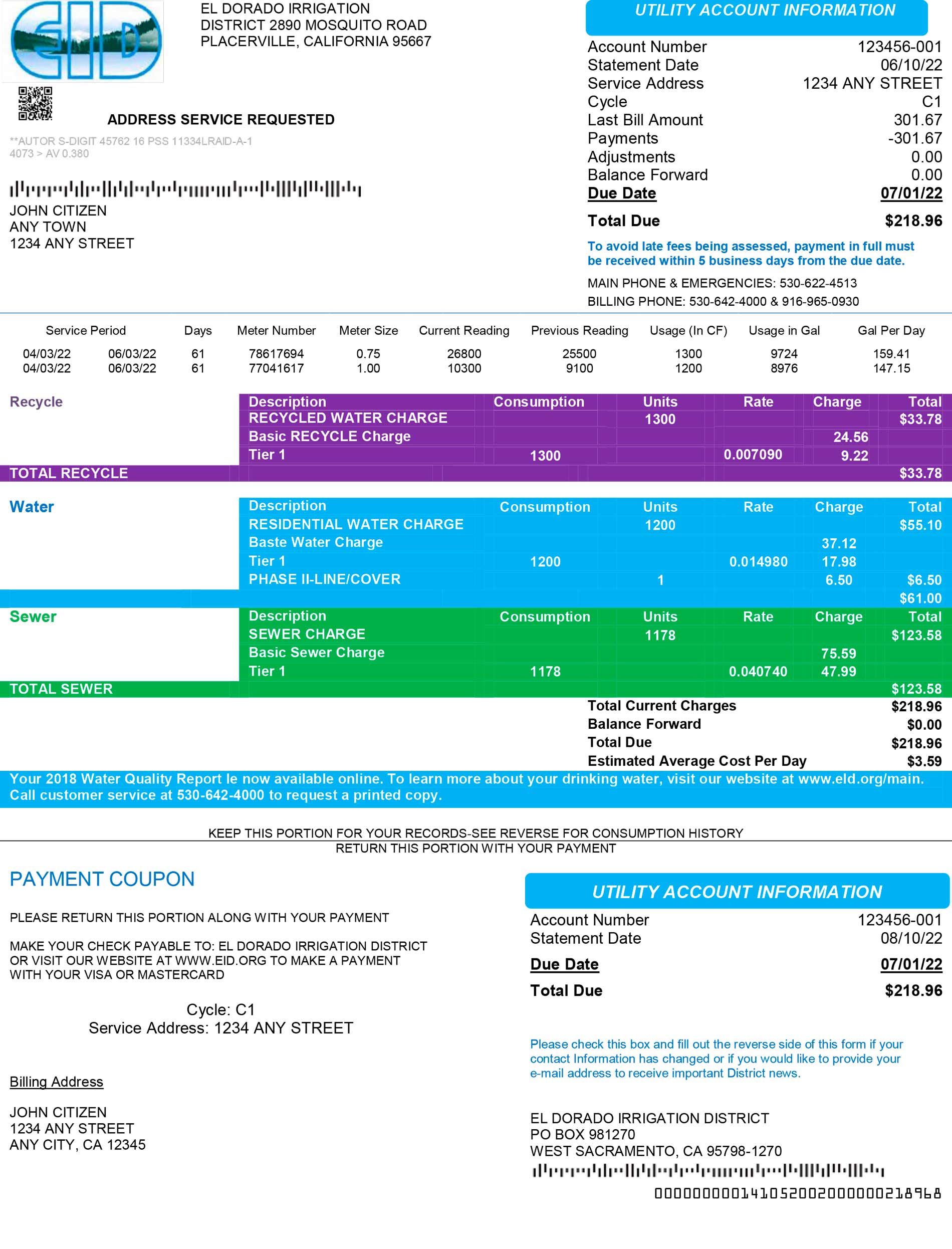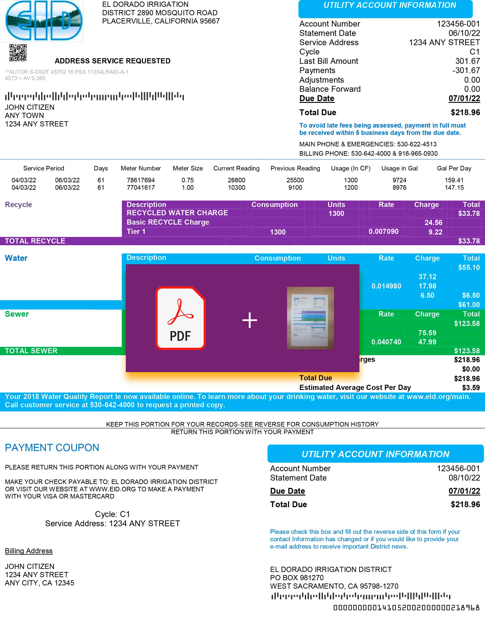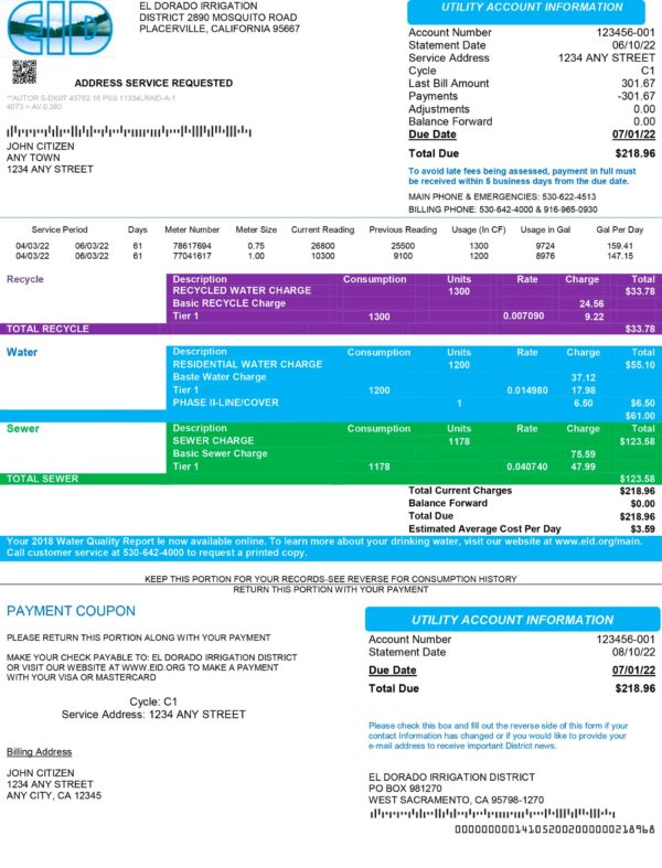 The Editable EID Utility Bill Template – California 2025 Water Format provides a professional, high-resolution (300 DPI) layout modeled after the authentic design of El Dorado Irrigation District statements. It’s ideal for designers, compliance specialists, and KYC/POA professionals needing a realistic, editable file for billing visualization, verification interface testing, or documentation previews. The Done-For-You structure ensures everything is customized by our team—no manual editing or software setup required.