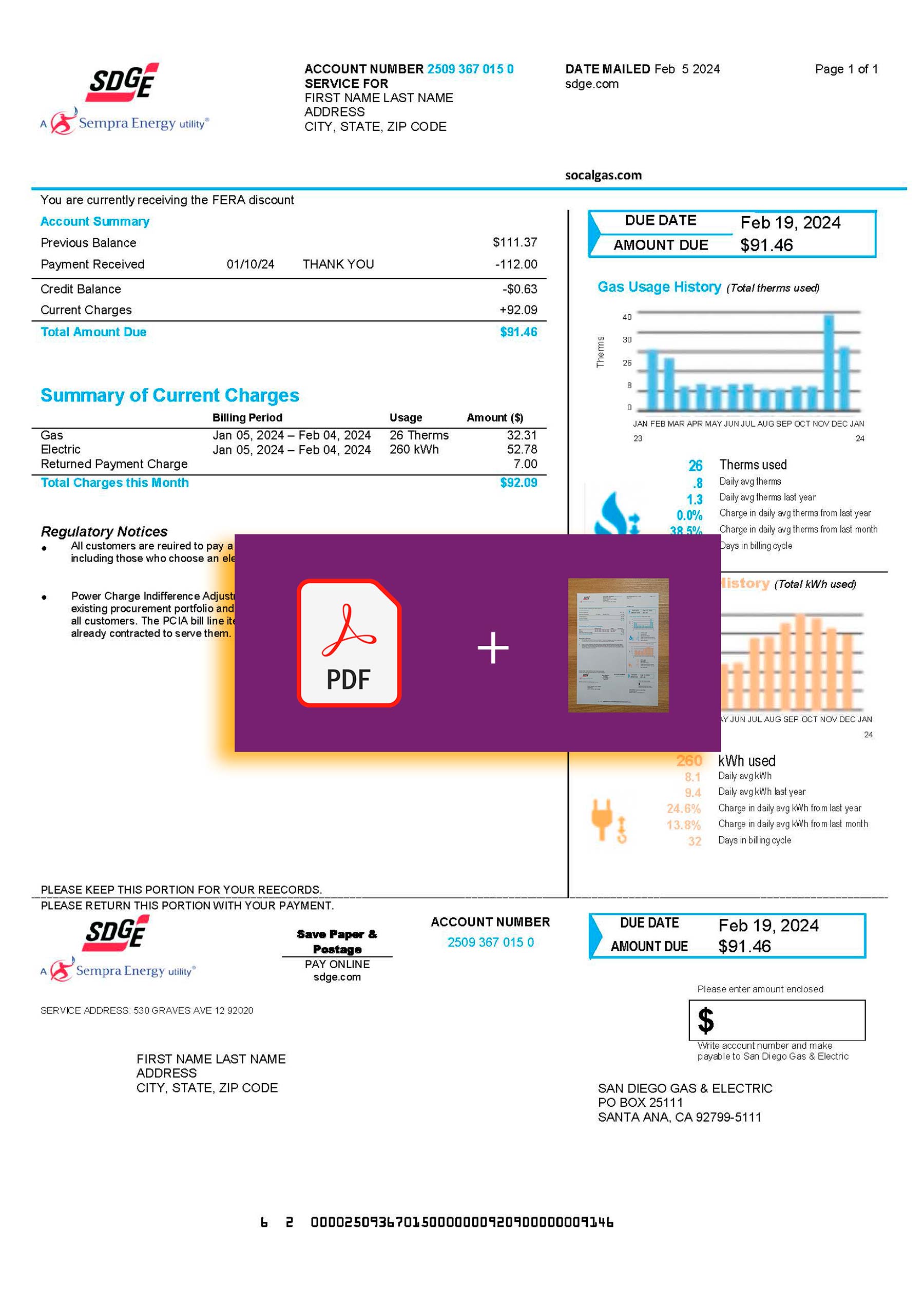 This editable SDG&E bill is meant strictly for lawful and ethical uses such as documentation previews, KYC/POA simulations, or UX design testing. It must not be used for any unauthorized or deceptive purpose.