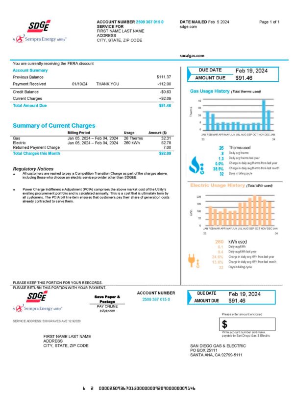 You’ll receive PDF and JPEG files, each in 300 DPI for sharp visual quality. The format aligns with SDG&E’s official layout for California and includes editable elements such as customer name, service address, billing period, meter readings, and totals. This package also features free revisions until approval, secure checkout, 24-hour delivery, and ongoing 24/7 support for client requests.