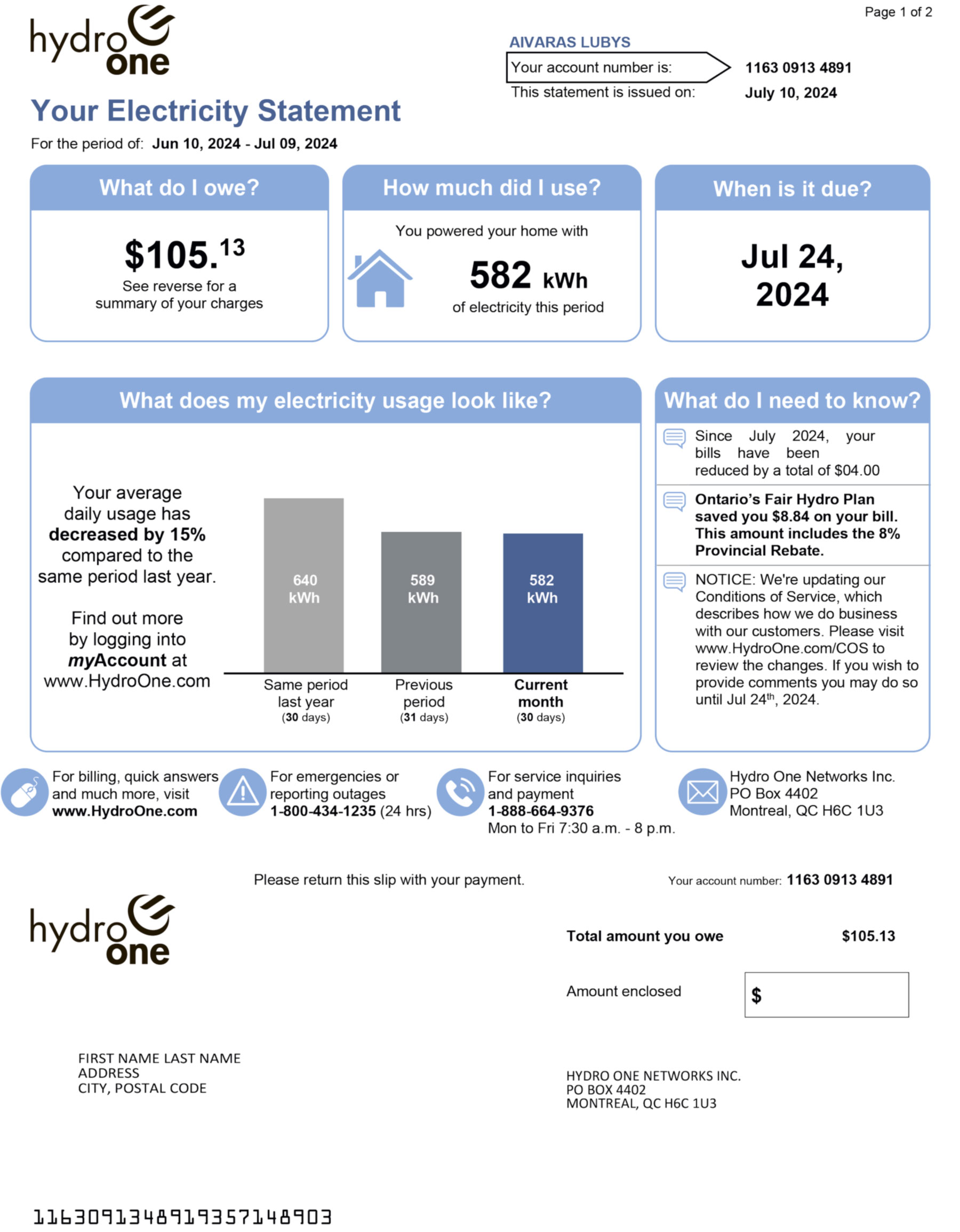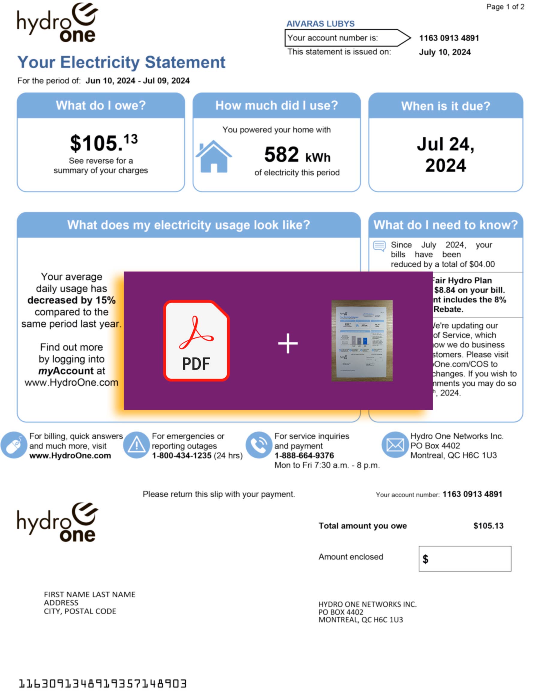 Includes files in JPEG or PDF + JPEG formats, optimized for both screen and print. The design follows Hydro One’s billing layout used across Canada, featuring editable fields such as customer name, address, billing cycle, service charges, and totals. You receive free revisions until approval, delivery within 24 hours, secure payment processing, and 24/7 customer support for guaranteed satisfaction.