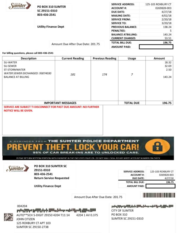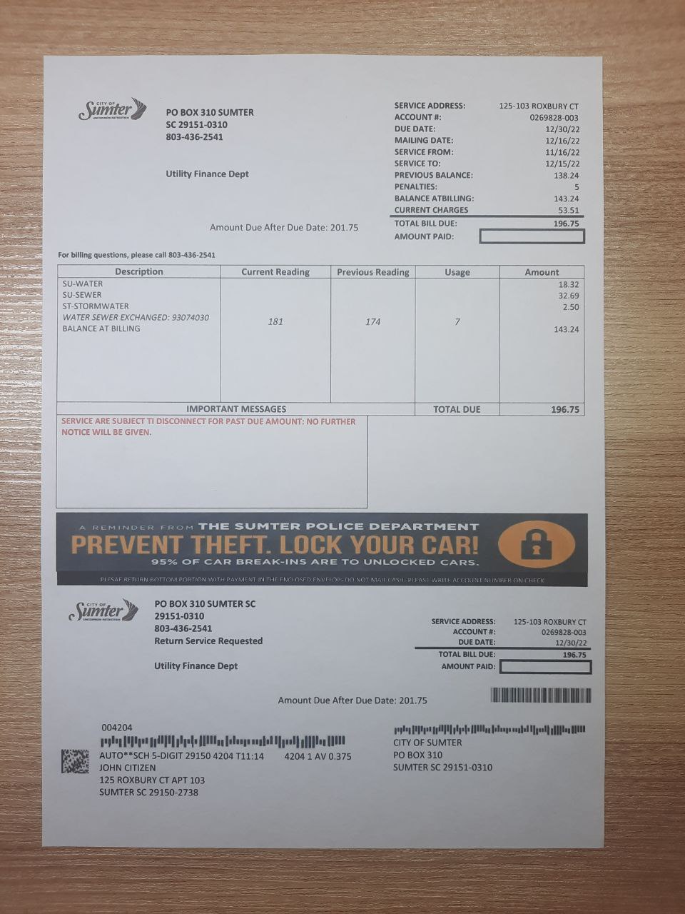 You’ll receive high-resolution PDF and JPEG files formatted at 300 DPI and visually aligned with the Sumter utility statement layout for Connecticut. Editable fields include customer name, address, billing period, account details, and total charges. The package also includes secure checkout, free revisions until approval, 24-hour delivery, and 24/7 dedicated support for updates or questions.